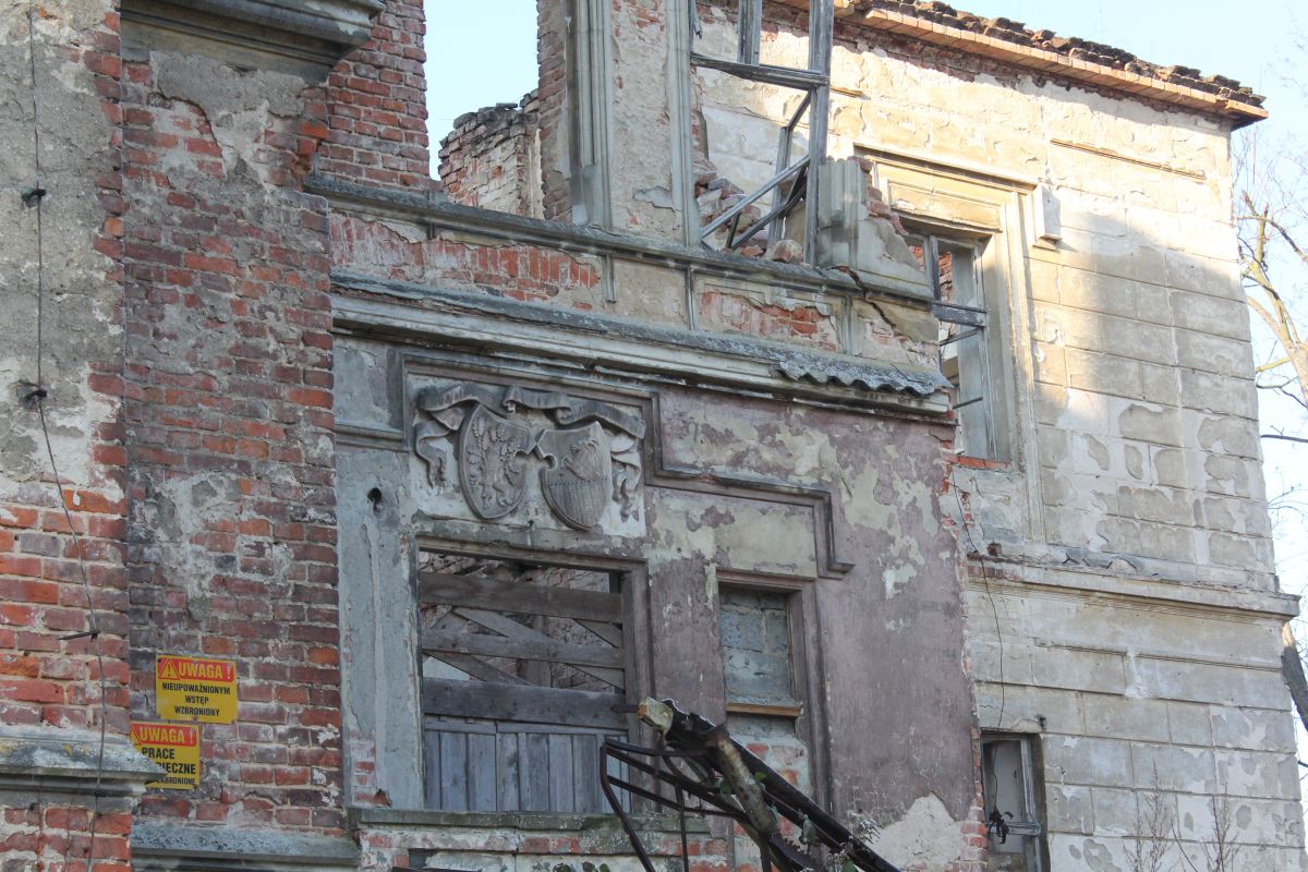 Na przykład pierwszy odwiedzony przez nas Gałów okazał się być sprzedanym, a więc od strony głównej drogi jakby trochę ogrodzony. I mnie to bardzo cieszy! Jest szansa, że w końcu ktoś się tym miejscem zamie, może odrestauruje, albo przynajmniej zaopiekuje. Trochę jakby odrodzenie oznaczało w tym przypadku ogrodzenie i wielkiego owczawa wokół budynków wokół pałacu – stajnie/ wozownie? Ale nie samego pałacu 😀