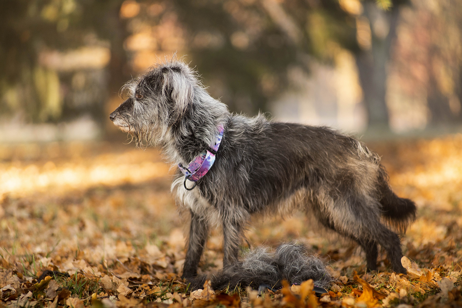Tu cała uroda szelek leży w ich zabudowaniu. Albo nawet nie tyle uroda- choć tego im odmówić nie można – jest powierzchnia do zagospodarowania wzorem 😀 , ile przyjemność noszenia dla psa. Przynajmniej dla Pufiny 😀 Widzę, że dosłownie i w przenośni- lepiej jej leżą szersze przody. Może wygodniej się jej układają na klatce, z przodu. Może mniej się wrzynają. A na bank o wiele mniej się przekręcają, co niestety jest zawsze u nas udziałem guardów, jak dobrze by ich nie dopasować.