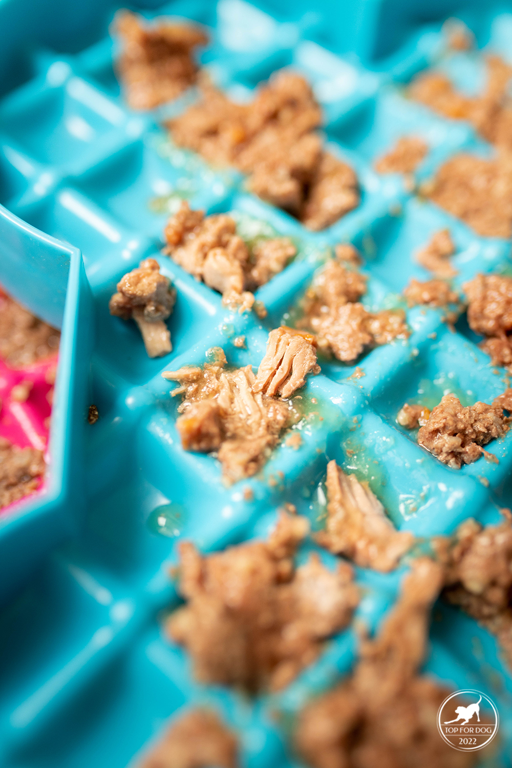 W przypadku połowy porcji czyli traktowania puszki jako coś ekstra- załadowanie konga itp, obu dziewczynom wchodzi idealnie, niezależnie który rodzaj (bardziej czy mniej suche) czy smak jedzenia dostają. Jednak jeśli dostały przydziałową ilość , wg rozpiski, na swoje kilogramy, u Pufy była zdecydowania różnica w przyjmowaniu. U Bu już nie.