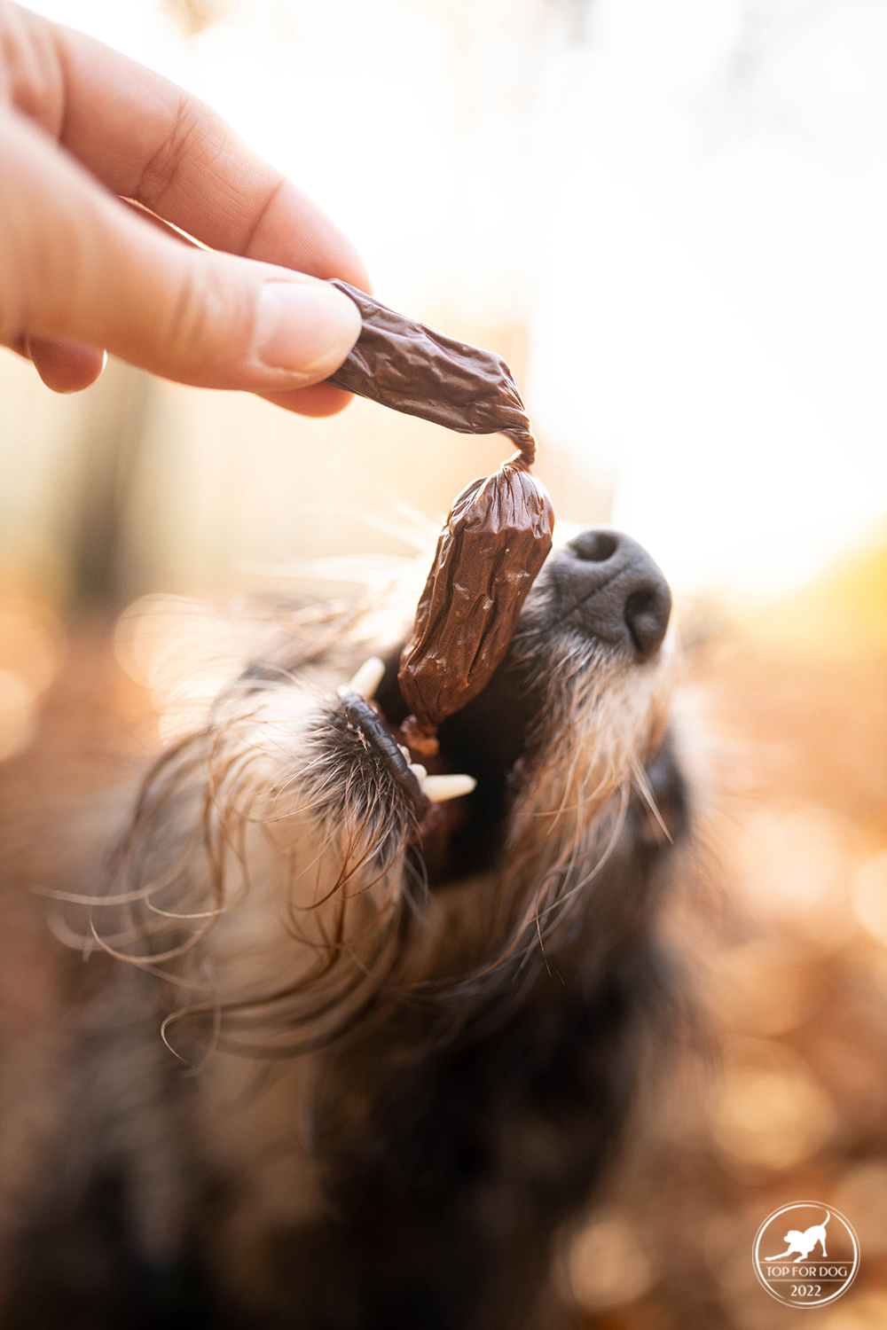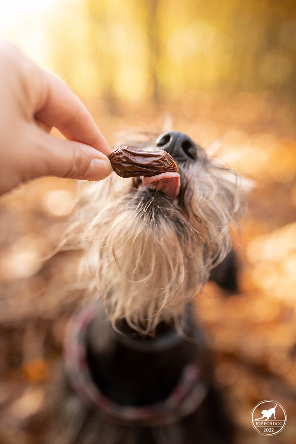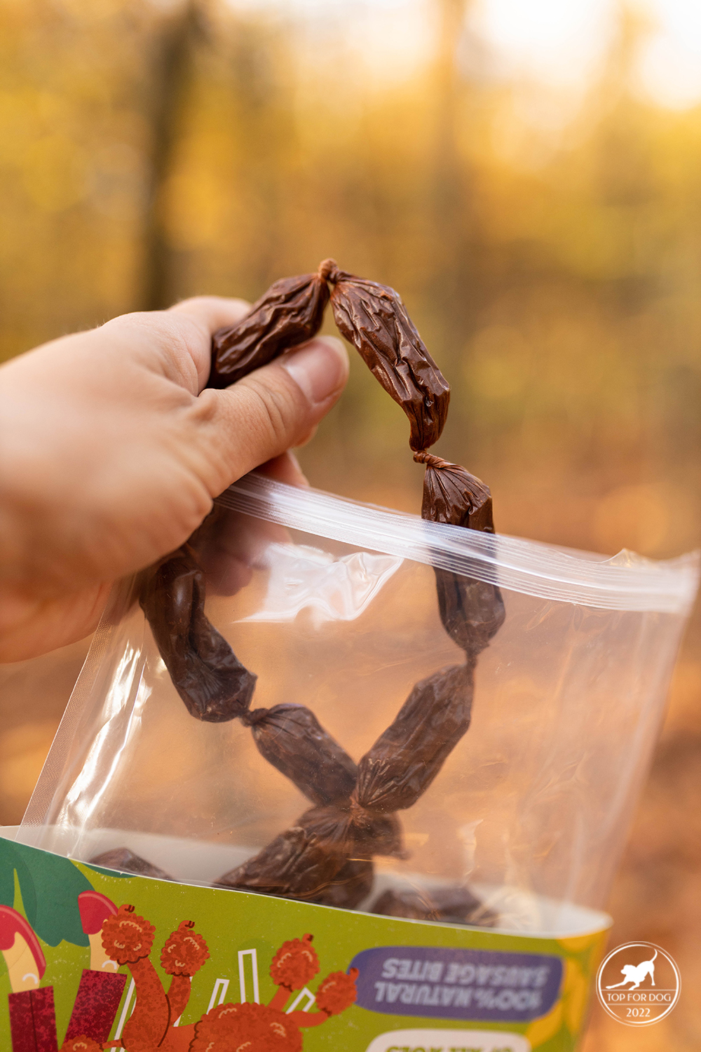 Z tak samo uroczym designem opakowania i wielkością dobrą też dla małych paszczy. Pojedyncze kiełbaski łatwo rozdzielić od sznura całości. Podział pojedynczej jest już trudniejszy, to mięcho w formie zasuszonej. Można pokroić na opartego,ale razem z Suczami mówimy – ale po co? Nawet ja, przodująca w wydzielaniu dziewczynom małych porcji dodatków, lubująca się w mikro groszkach karmy mówię – nie widzę sensu dzielenia. To nie smaczki treningowe a przekąska. Ja lubię zabrać je na spacer, rzucić do przegryzienia na przystanku w trasie. A że z małą najczęściej jakiś taki wleci, to akurat. Lekkie, nie za duże, sycące
