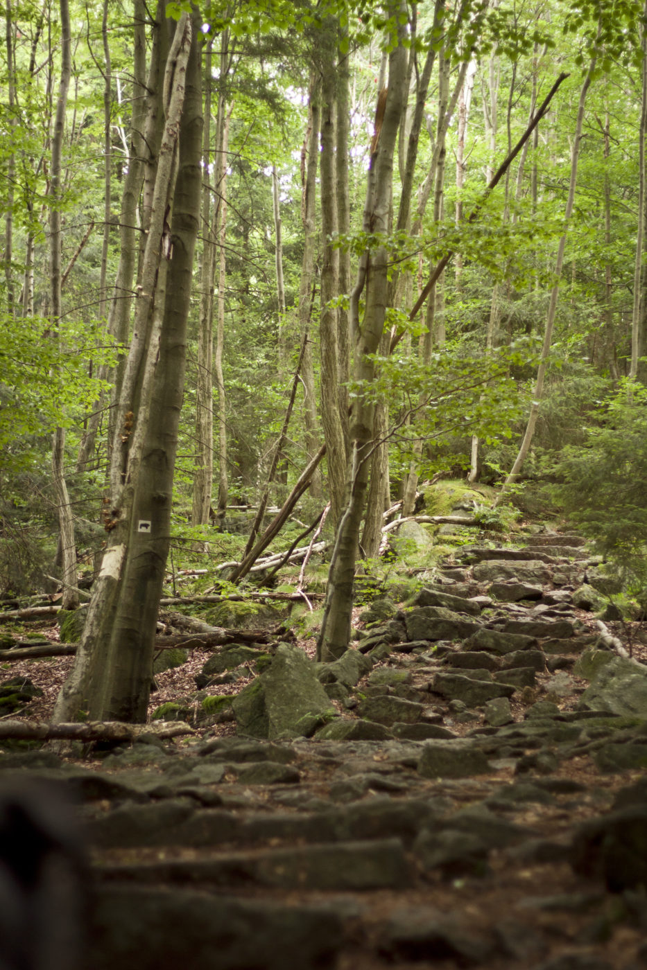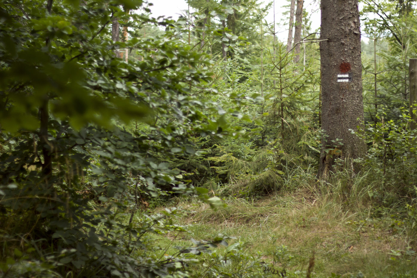 Ja jestem wielką fanką tych czeskich. Ułatwiają mi poruszanie się spacerowe, mają oznaczone nie tylko oficjalne szlaki ale i ścieżki. A przecież po lasach i bezdrożach nie wędrujemy tylko szlakami . Tak wiec trzeba mieć na uwadze pewne rozbieżności. Poza innymi kolorami, na czeskiej istnieje łącznik z punktu „Rozdroże nad Sadami” wprost do szlaku niebieskiego, o który nam chodziło. Bo to właśnie niebieski miał nas doprowadzić wprost na sam szczyt. Wybraliśmy tą trasę ponieważ była na naszych mapkach, przed nami podreptało nią kilka osób, a sam szlak na żywo, tak wiecie-w realu również był oznaczony. Misiem 😉 czyli jako szlak archeologiczny. Tak czy siak stay tuned, oczy otwarte i cały czas kontrolujcie gdzie idziecie, niezależnie z jakiego nawigowania byście nie korzystali