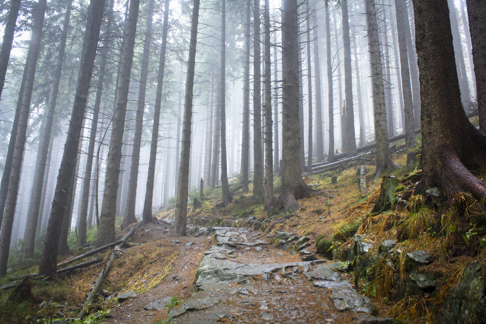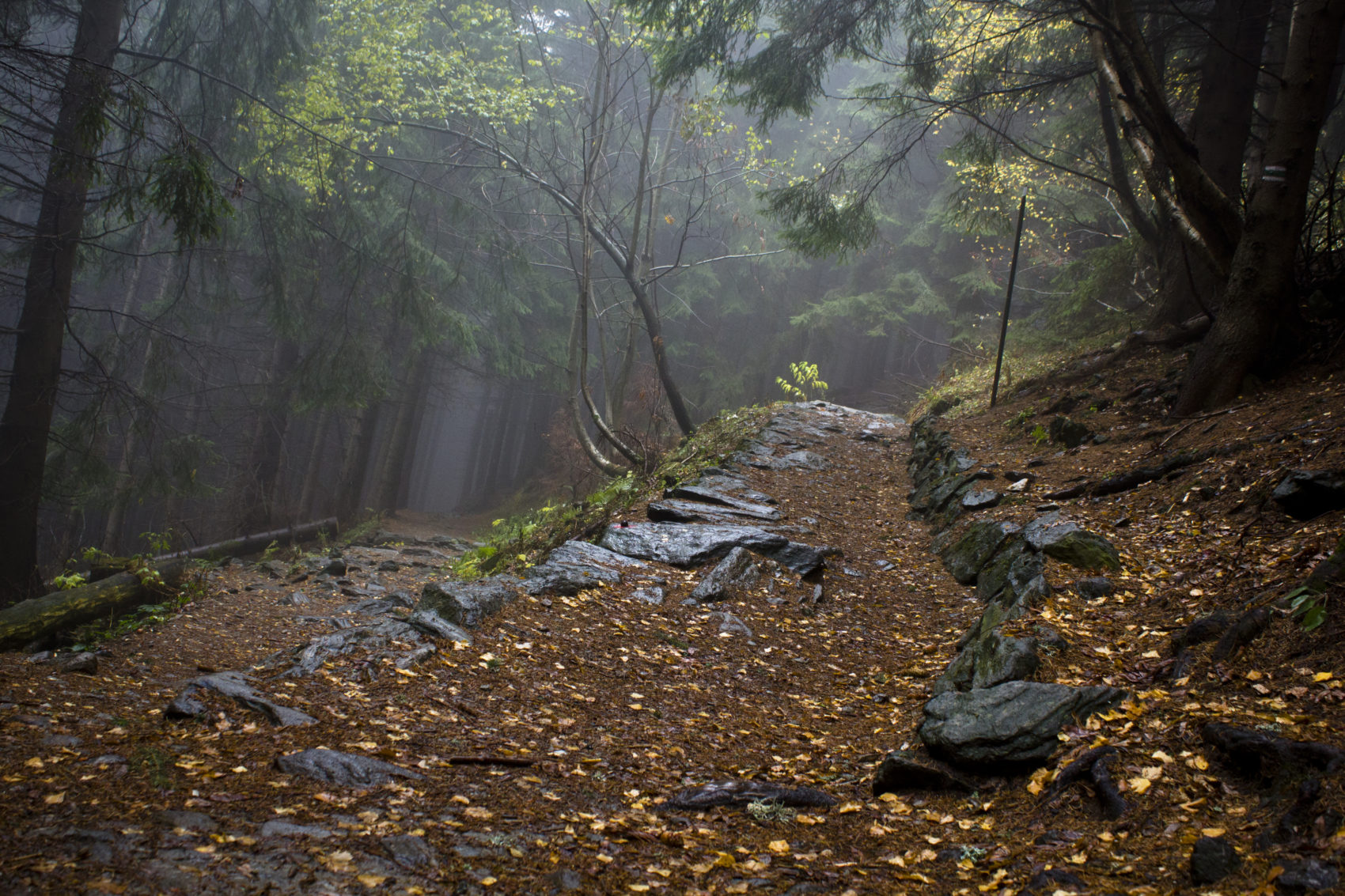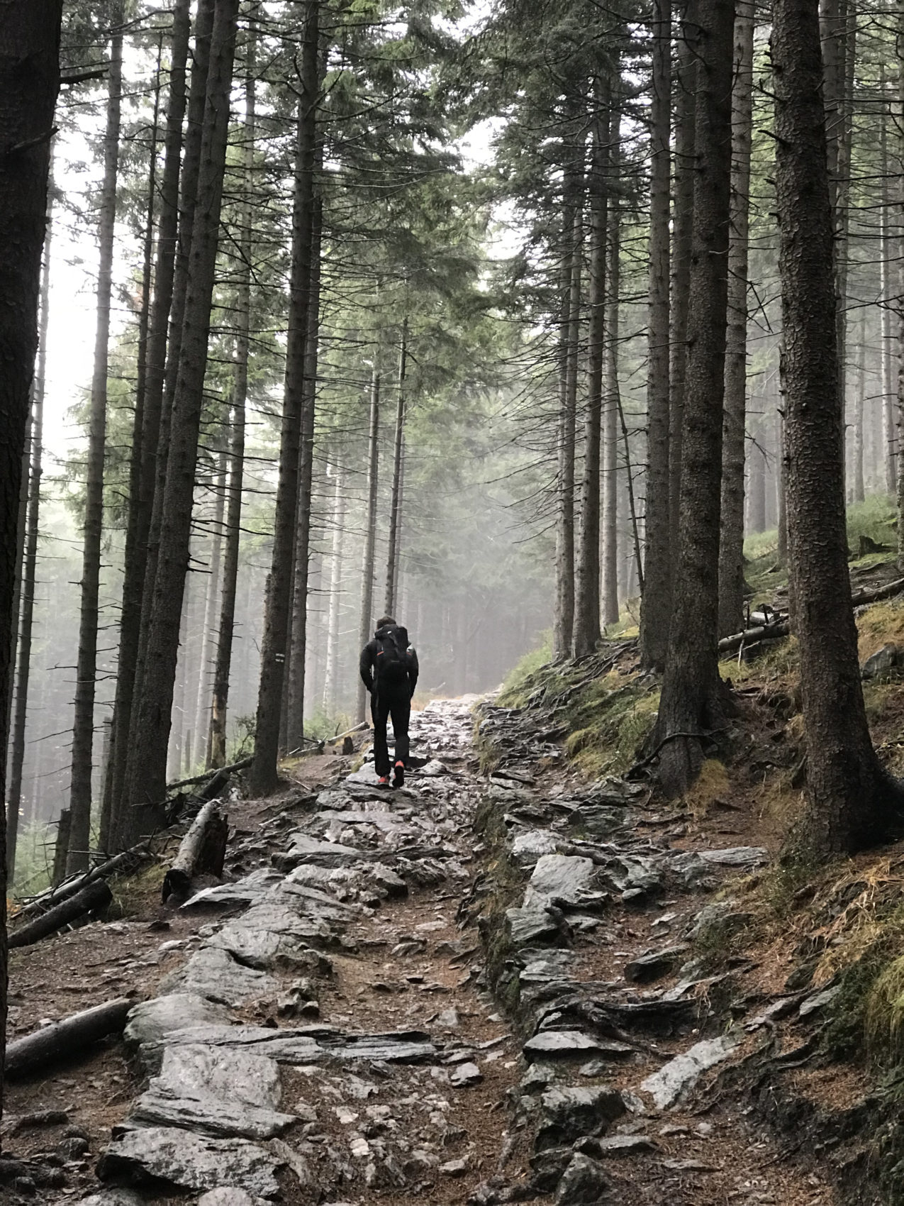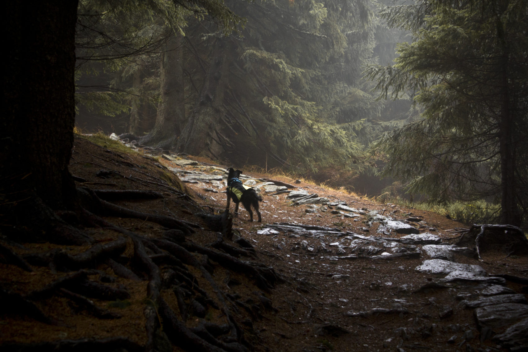 Zaczynamy szlakiem ZIELONYM, wiodącym nas dość intensywnie w górę przez las, po kamieniach. Na szczęście są to kamulce przyjemne dla psich łapek, ale w taką mglistą , deszczową pogodę na jaką my trafiliśmy trzeba uważać na poślizg na nich. Mimo, że dość długo wędrowaliśmy gęstym lasem, zdarzały się prześwity w drzewach, w których już można podziwiać widoki. Moim zdaniem widoki są cudne nawet, kiedy góry spowija mgła <3 Jak dla mnie trafiliśmy na klimat po tysiąckroć lepszy niż w letni przejrzysty nudny! dzień . Kto się zgadza, palec pod budkę !