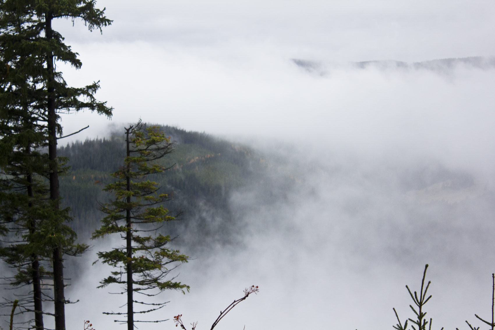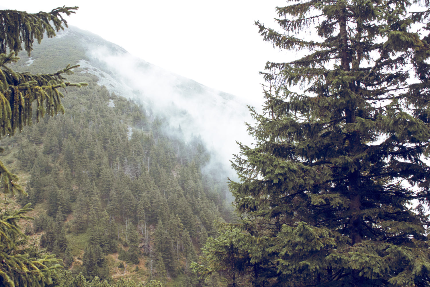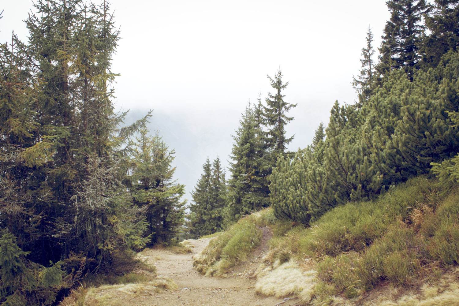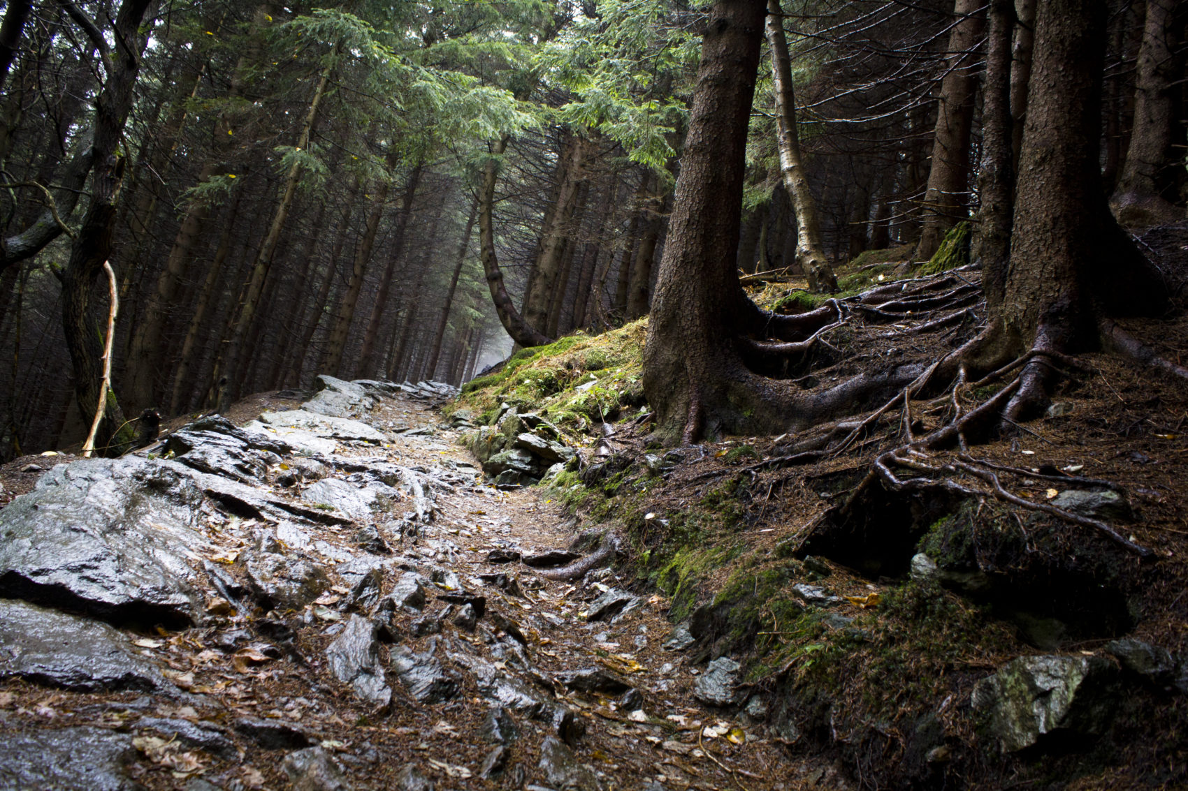 Zaczynamy szlakiem ZIELONYM, wiodącym nas dość intensywnie w górę przez las, po kamieniach. Na szczęście są to kamulce przyjemne dla psich łapek, ale w taką mglistą , deszczową pogodę na jaką my trafiliśmy trzeba uważać na poślizg na nich. Mimo, że dość długo wędrowaliśmy gęstym lasem, zdarzały się prześwity w drzewach, w których już można podziwiać widoki. Moim zdaniem widoki są cudne nawet, kiedy góry spowija mgła <3 Jak dla mnie trafiliśmy na klimat po tysiąckroć lepszy niż w letni przejrzysty nudny! dzień . Kto się zgadza, palec pod budkę !