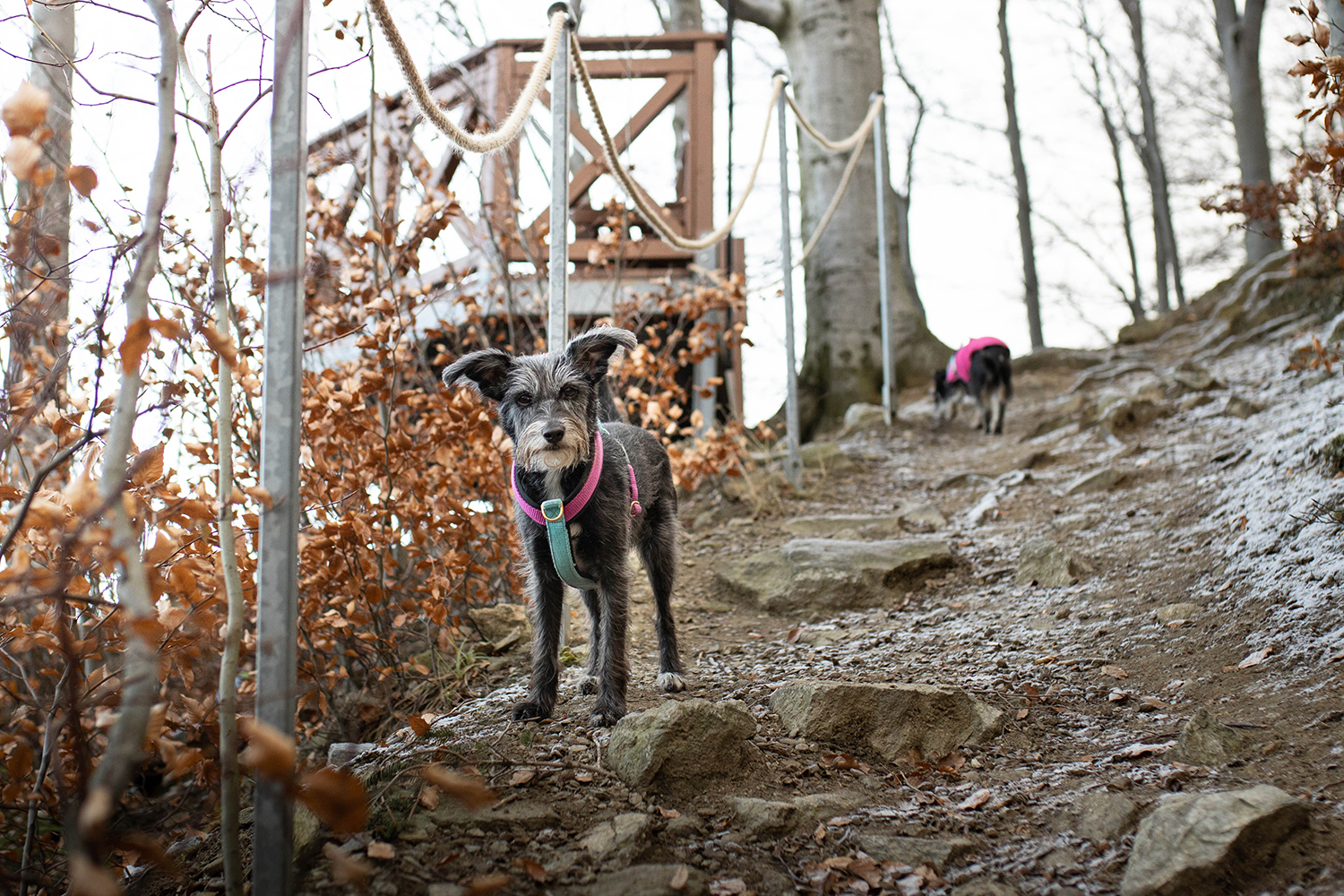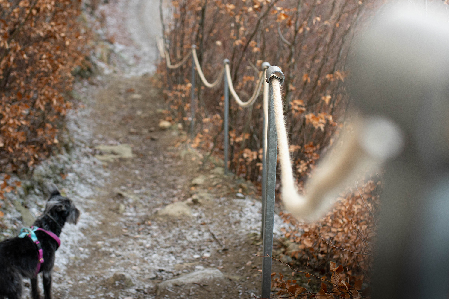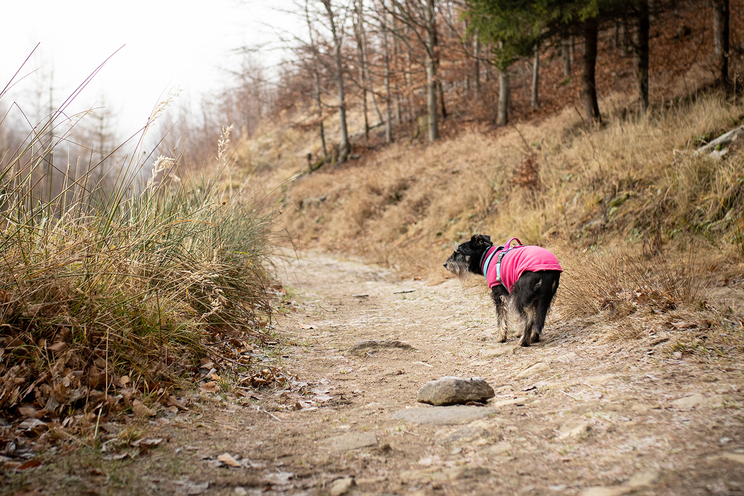 Zniknęły czerwonawe kolory na rzecz okalającego nas chłodu i wiatru. Kolorystyka zrobiła się mocno zimowa, mimo, że wtedy nikt nie podejrzewał że tej zimy trochę białym puchem jednak sypnie. Wywiało nam uszy a suczydłom zmroziło brody. Niesamowite, że wędrując po tak mimo wszystko niskich górkach, możemy szybko zmienić warunki, w których idziemy. Wniosek jest taki, że nawet z niskimi górami żartów nie ma. Zarówno my jak i psy powinny być na to przygotowane, nie tylko psychicznie