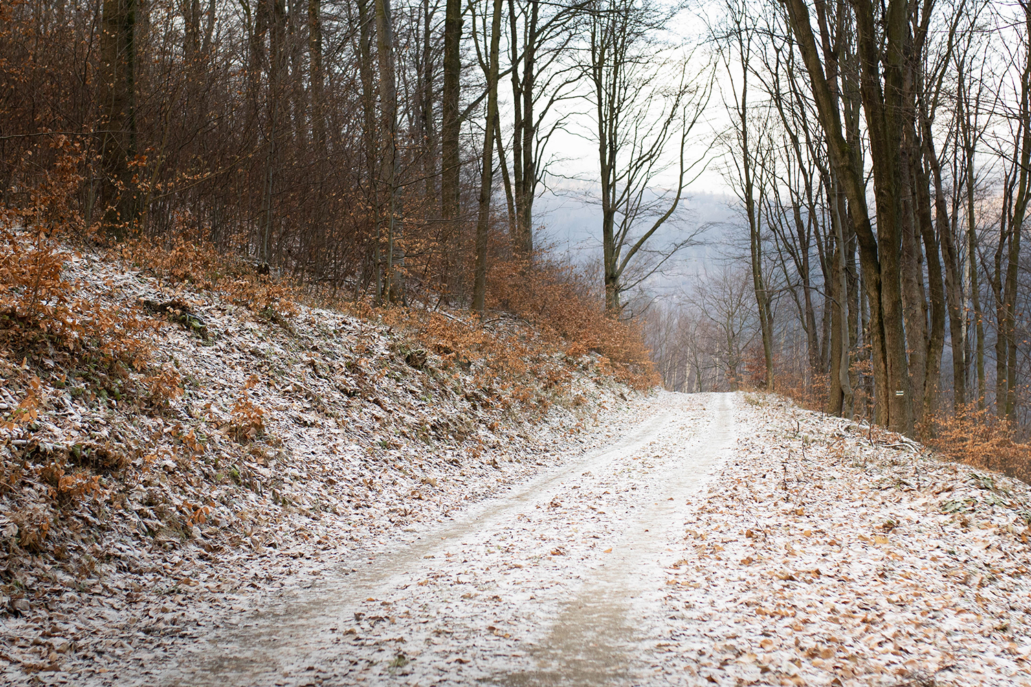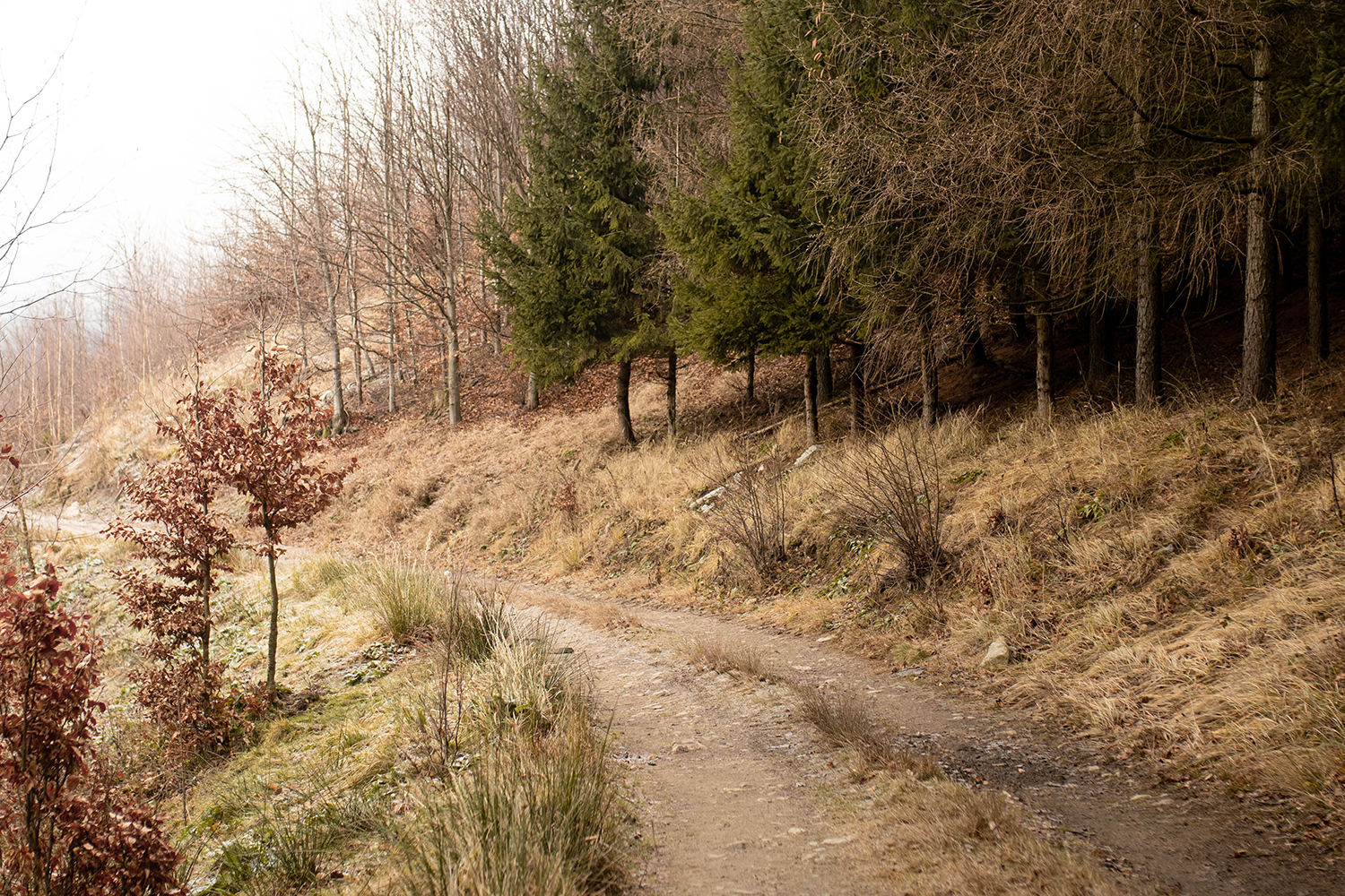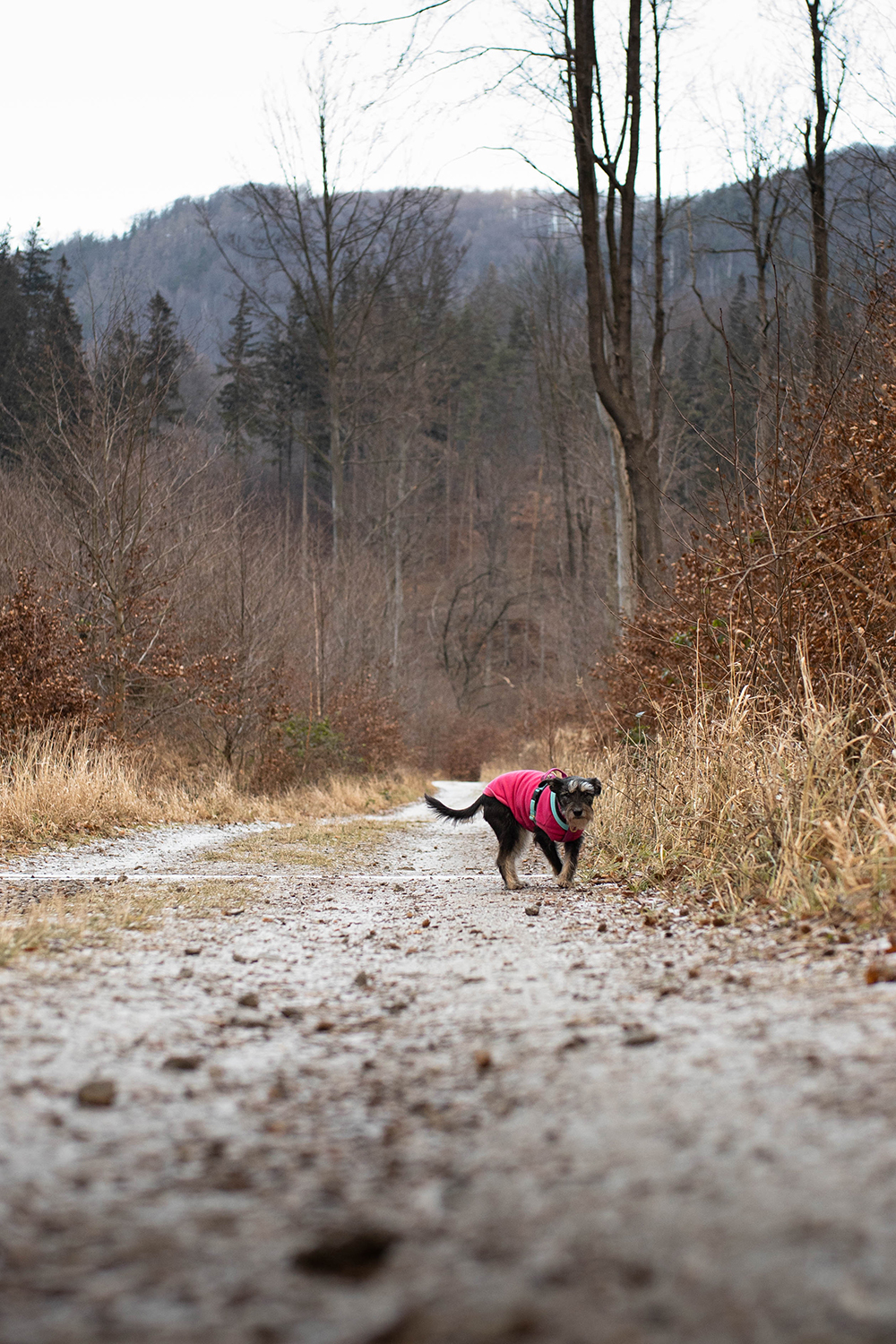 Zniknęły czerwonawe kolory na rzecz okalającego nas chłodu i wiatru. Kolorystyka zrobiła się mocno zimowa, mimo, że wtedy nikt nie podejrzewał że tej zimy trochę białym puchem jednak sypnie. Wywiało nam uszy a suczydłom zmroziło brody. Niesamowite, że wędrując po tak mimo wszystko niskich górkach, możemy szybko zmienić warunki, w których idziemy. Wniosek jest taki, że nawet z niskimi górami żartów nie ma. Zarówno my jak i psy powinny być na to przygotowane, nie tylko psychicznie
