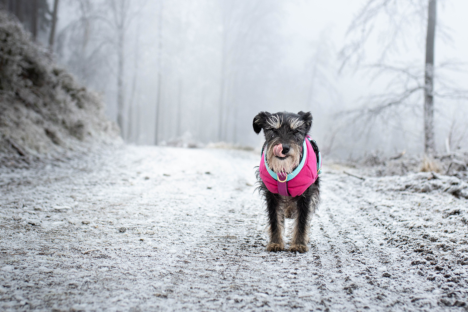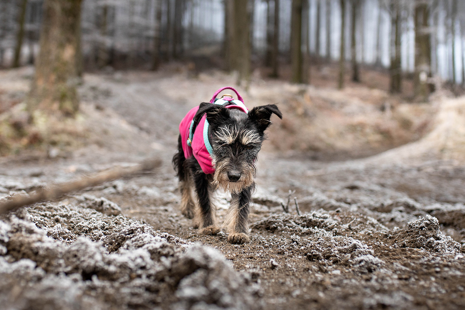 Pufka od pierwszych chłodów czyli od ok 10 stopni na termometrze biega w sweterku.  Nie jest to mój wymysł, a jej zdrowie. To ten typ psa, którego natura nie obdarzyła futrem chroniącym od chłodów. A raczej nie natura tylko ludzka selekcja, w celu uzyskania rasy. Gen sznaucera sprawia , że mała marznie i się przeziębia, a moim obowiązkiem jest ubrać ją tak, by każdy spacer był dla niej przyjemnością, a nie walką o przetrwanie. Zimą w moim plecaku ląduje również awaryjne nakrycie grzbietu Bu.