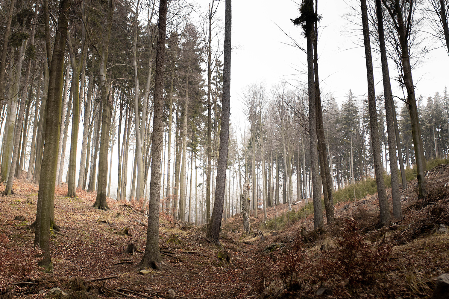 Kiedy ponapawacie się widokami, albo jak my- mgłą zmieszaną z nisko zawieszonymi chmurami, proponuję ruszyć dalej. Nawigacja jest bardzo prosta, ścieżki szerokie i nie ma wątpliwości gdzie iść dalej. Ja proponuję obejść Koci Grzbiet czyli górkę na której jest punkt widokowy, by wpaść na szlak czerwony. A że ja do szlaków nie lubię się przywiązywać, za to lubię zataczać kółeczka na mapie, później dobrą opcją okazał się przeskok na szlak czarny, I mimo, że łącznik żadnym szlakiem nie był, jest to kolejna szeroka droga.