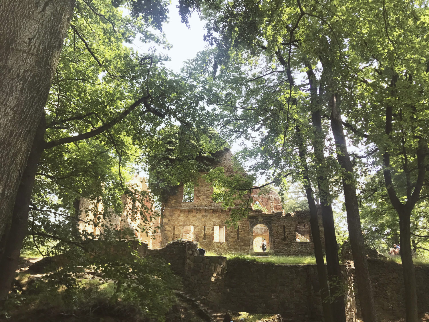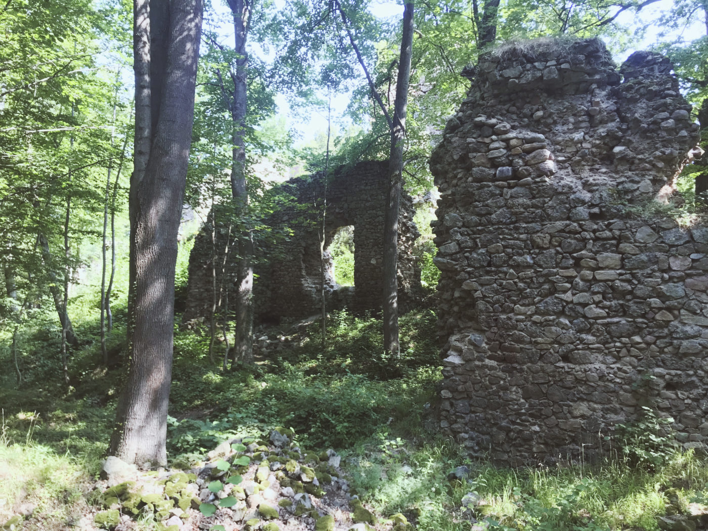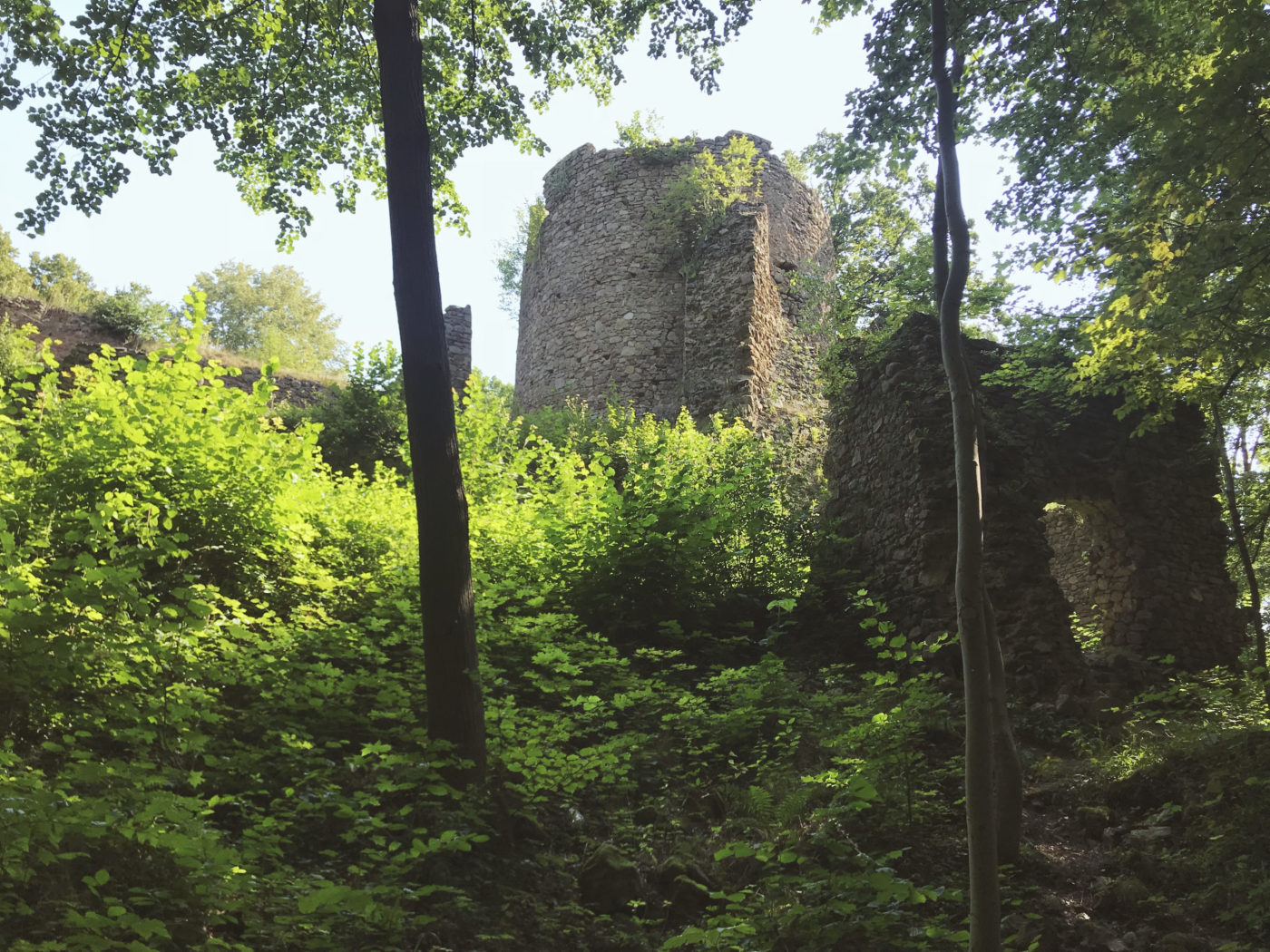 Szlak do Zamku nie jest wymagający, jest wręcz geriatrycznie spacerowy. Dreptamy szlakiem NIEBIESKIM, który potem łączy się z ZIELONYM (szlakiem Zamków Piastowskich) kierując się według oznakowania na Zamek Cisy. Jedyne utrudnienie zaczyna się przy dostaniu się na teren ruin. Mostek kiedyś był, ale się zmył, teraz trzeba jakoś go obejść, żeby znaleźć jedno z wejść. Poprowadzą Was, jak i nas, wydeptane ścieżki. To taka filozofia podróżnicza – nie wiesz gdzie iść – obczaj gdzie ktoś już coś wydeptał 🙂
