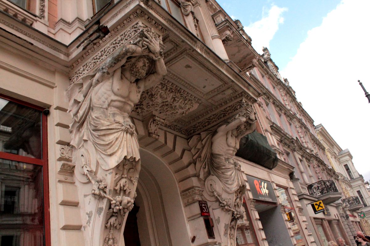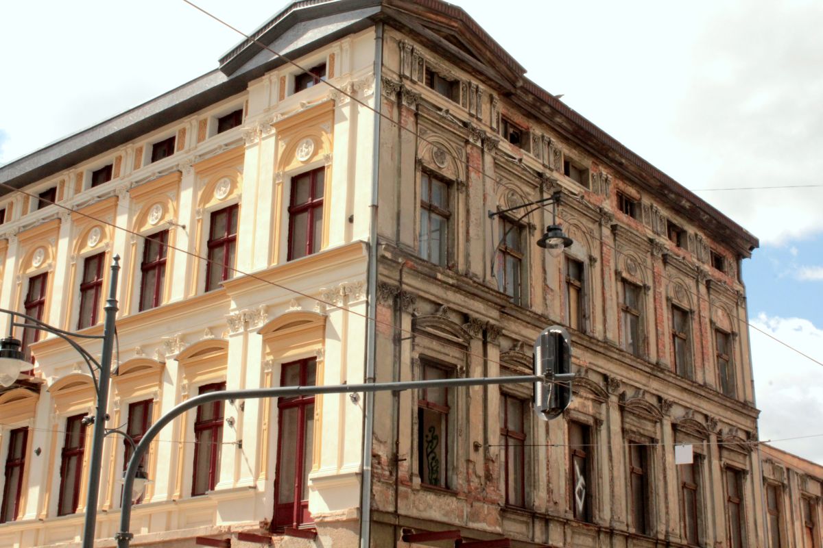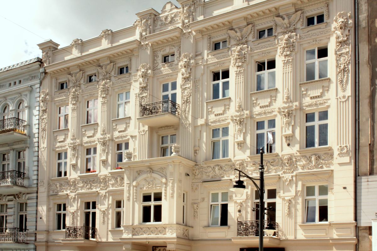 (Łódź pełna jest architektonicznych perełek, o secesyjne kamienice można się dosłownie potknąć, niestety jak na razie całe miasto ma 2, bardzo różne oblicza. Często dosłownie stykające się ze sobą)