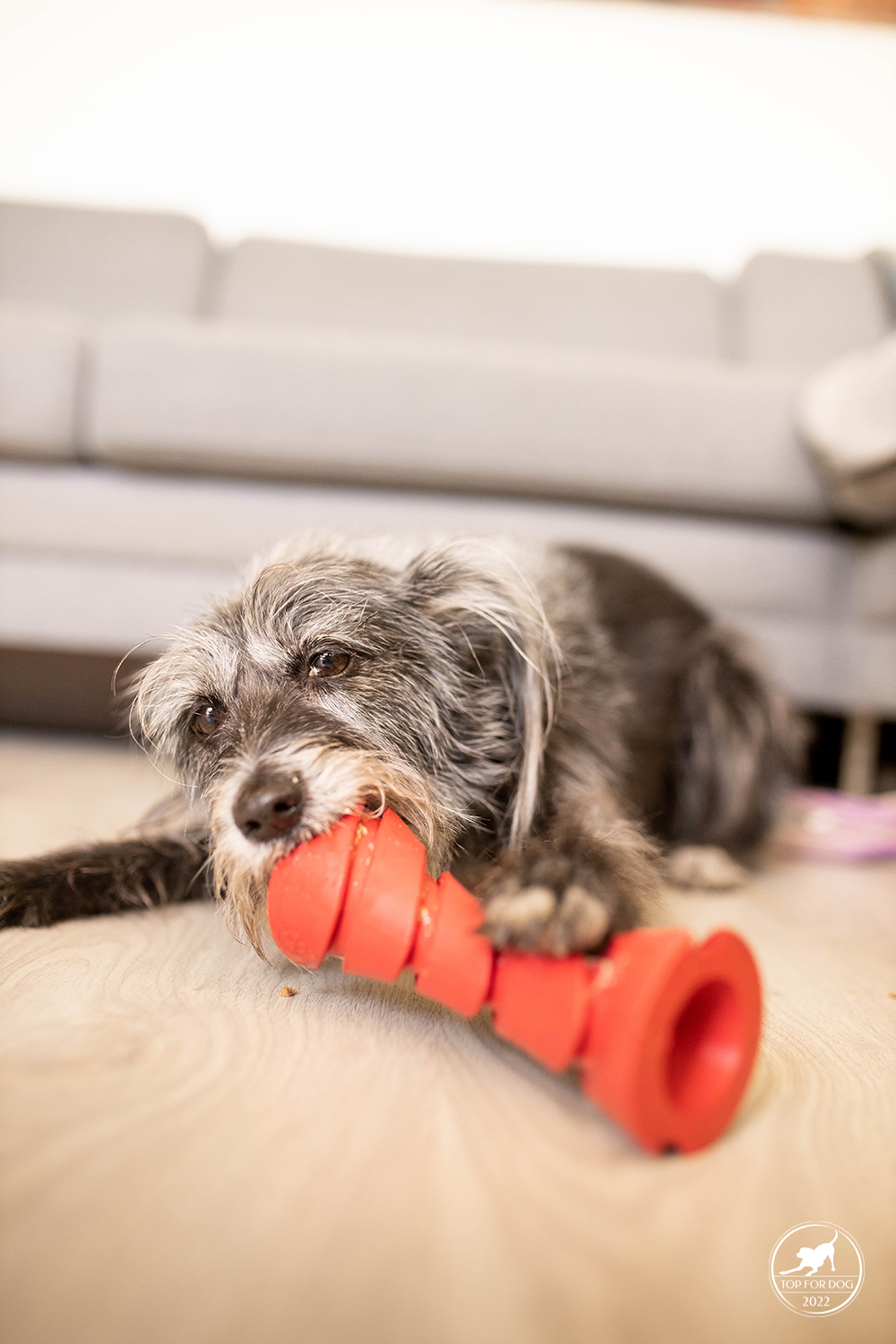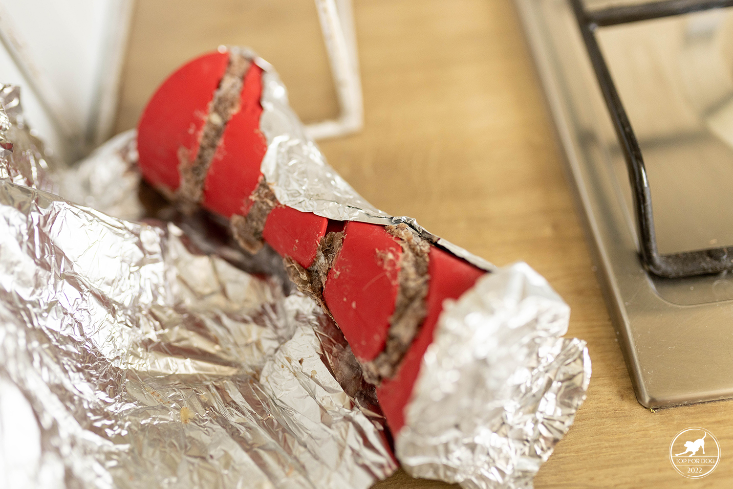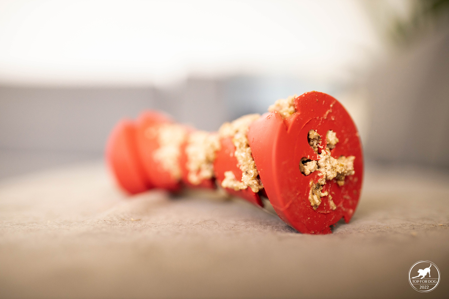 Takie drobne elementy jak rowki czy skomplikowany otwór wydłużają czas, jaki pies poświęci na wyciumkanie całej zawartości. U nas dodatkowo w przypadku Bu, przez kształt Dumbbell uciekał trochę po podłodze, a kulającą się zabawkę trzeba było gonić. Fakt, zrobiło się troszkę więcej bałaganu, ale na szczęście moje dziewczyny w wylizywaniu podłogi są mistrzyniami 😀