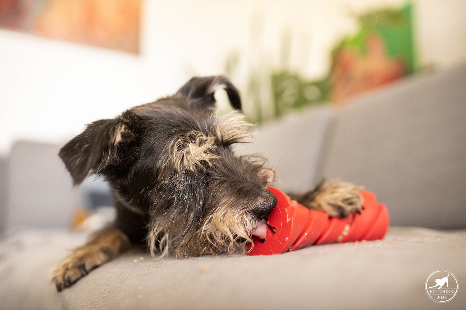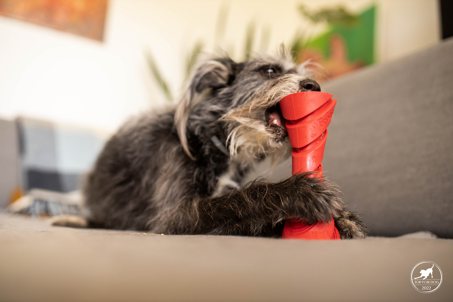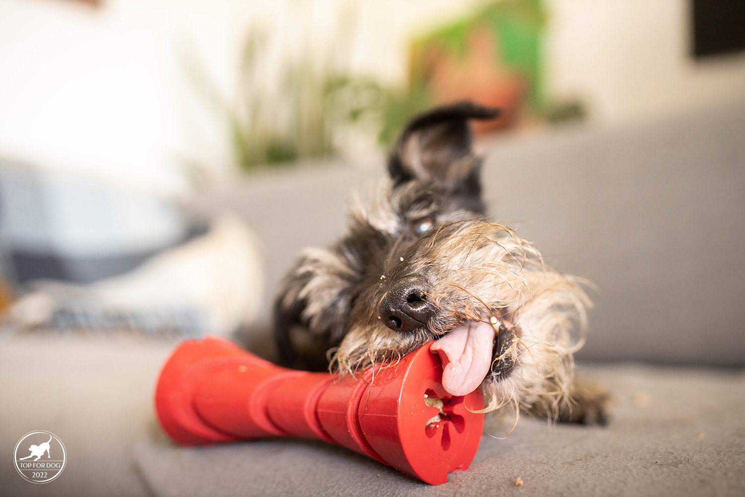 Takie drobne elementy jak rowki czy skomplikowany otwór wydłużają czas, jaki pies poświęci na wyciumkanie całej zawartości. U nas dodatkowo w przypadku Bu, przez kształt Dumbbell uciekał trochę po podłodze, a kulającą się zabawkę trzeba było gonić. Fakt, zrobiło się troszkę więcej bałaganu, ale na szczęście moje dziewczyny w wylizywaniu podłogi są mistrzyniami 😀