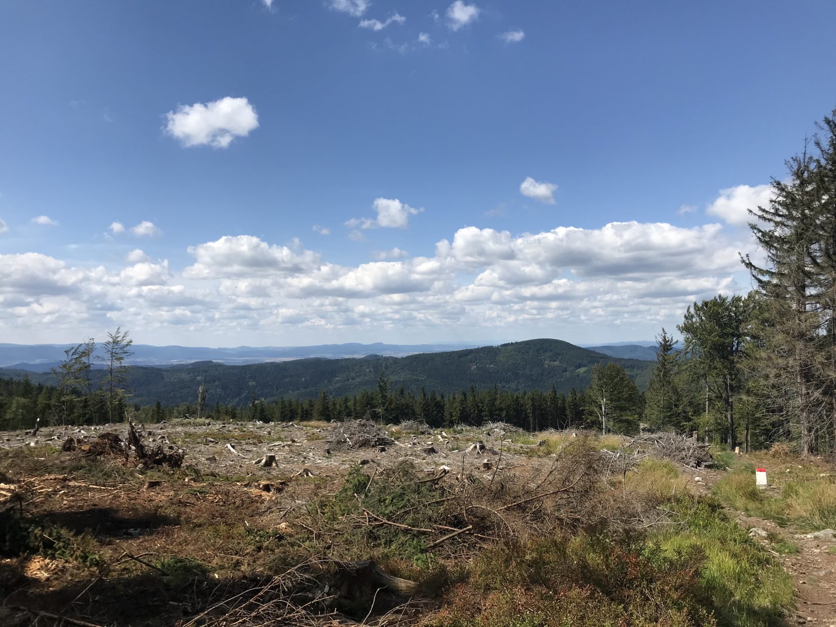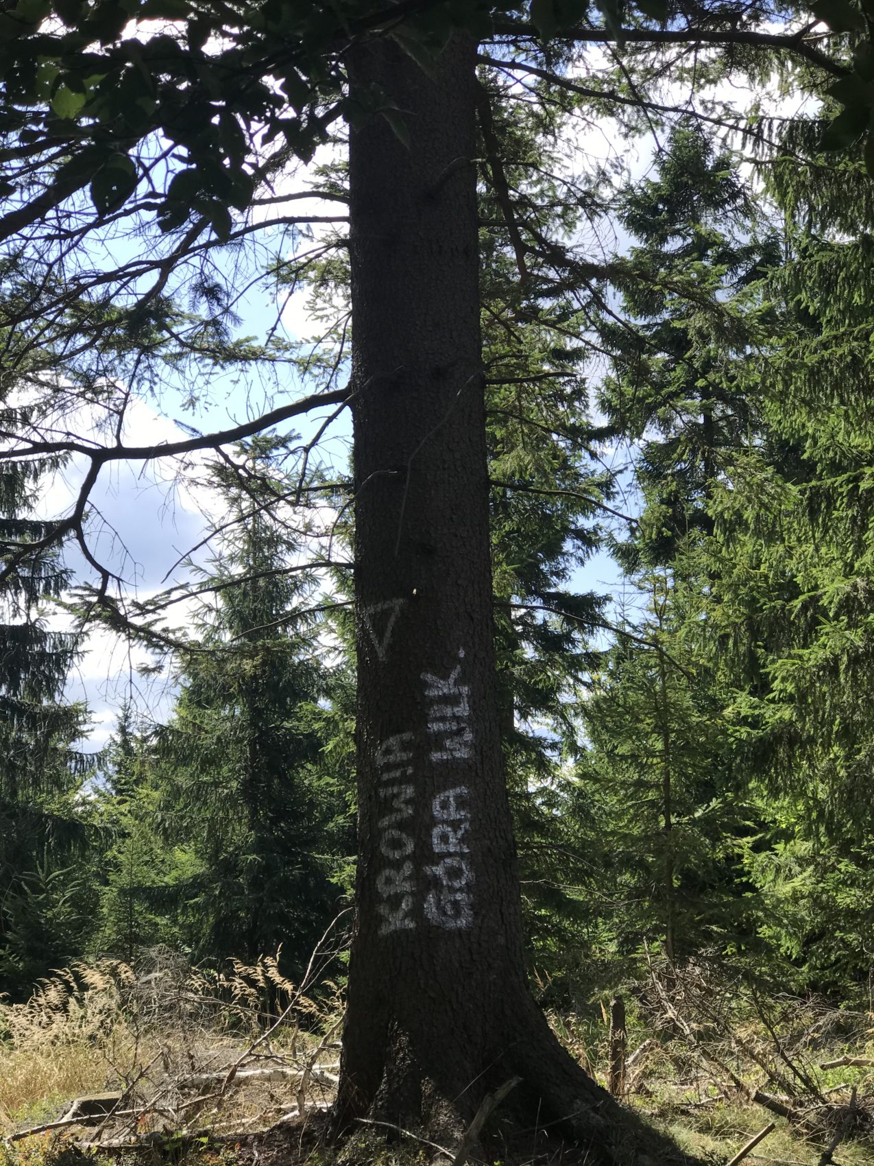 Z Jawonika postanowiliśmy ruszyć łącznikiem -szlakiem żółtym, który doprowadza do zielonego. Niby krótki odcinek, ale wejście na niego i przejście tych 600 m to małe wyzwanie. Już na początku czytajcie info na drzewach . Jakaś dobra dusza wysmarowała sprayem na drzewie info, że szlak żółty to właśnie TU, w krzaki . I przez krzaki trochę się trzeba przedrzeć. Kilka razy ścieżka, mało wydeptana nam uciekła, ratowały nas czeskie mapy na telefonie. Na szczęście to tylko krótkie przejście, za którym wpadamy już na szlak zielony.