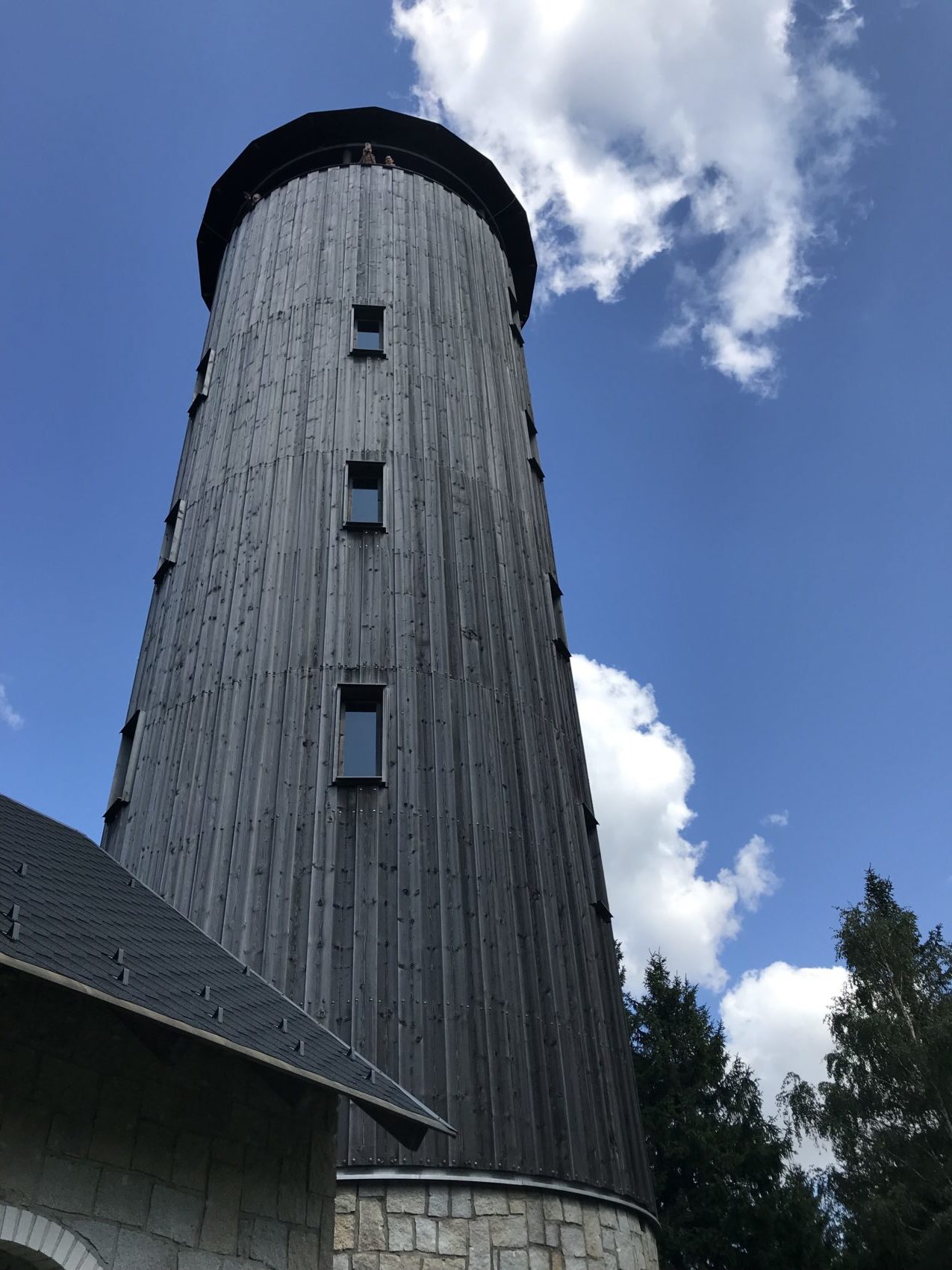 Borówkowa to bardzo fajny szczyt. Podwójny państwowo. Trochę nasz, a trochę czeski. Poza wieżą widokową,o wiele pokaźniejszą od tej na Jaworniku – na Borówkowej murowane wieżysko! , jest tu też spora wiata, miejsce ogniskowe i … sklepik! Można tu kupić jakąś kawę i herbatę, zimne czeskie piwerko i coś do zjedzenie. Przybytek prowadzony przez stronę czeską ale płatność i w koronach i w złotówkach. Info na forum sudeckim na facebooku mówi, że bardziej opłaca się w koronach, ja zapomniałam w pamięci dokonać zaawansowanych działań arytmetycznych ale wierzę na słowo. Najważniejsze że punkt jest, my przy okazji uzupełniliśmy zapasy wody dla psów.