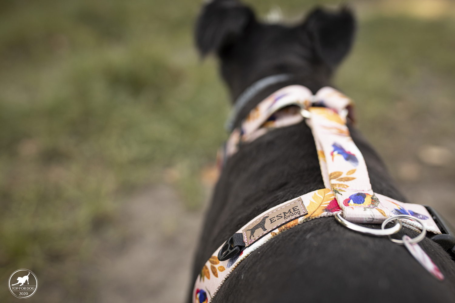 Na koniec, odchodząc od zachwytów nad wzorem, wysyceniem kolorów itd jeszcze parę technikaliów. Szelki posiadają regulację na obu obręczach. na przedniej są to dwa punkty w których regulujemy długość paska. Z tyłu -jeden. Regulowany jest również dolny pasek, ten przypadający pod brzuszkiem. Daje to spory zakres dopasowania w obrębie jednego rozmiaru. Jedyna klamra na szelkach to dopasowana do krzywizny psiego boczku klamra w typie D Flex.