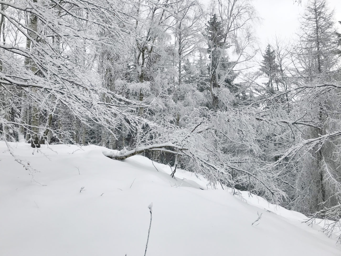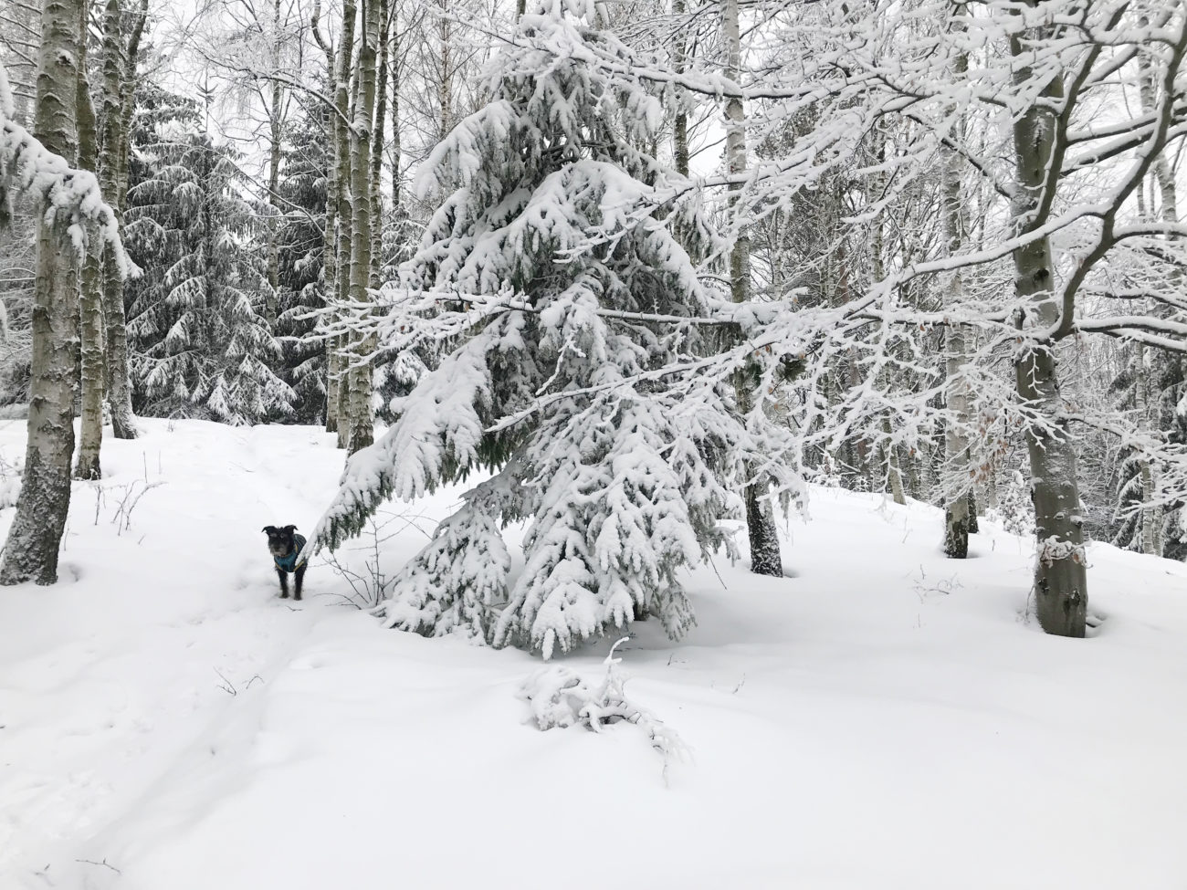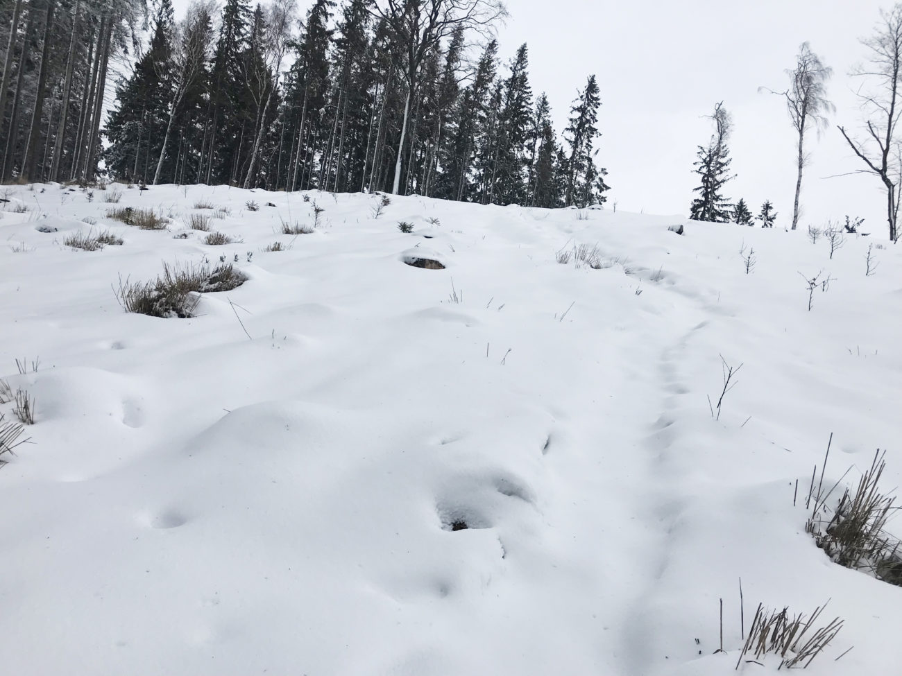 Przez całą trasę szliśmy nieprzetartymi ścieżkami , albo trasą która zapewne ścieżką może być. Nie było więc opcji żeby iść po czyiś szlakach czy po prostu po ścieżce. Zimowa wędrówka wymaga więcej sił- brodzenie w głębokim śniegu potrafi zmęczyć, i więcej uwagi- trzeba się koncentrować, zwłaszcza przy szlaku który wije się i zakręca to w górę to w dół