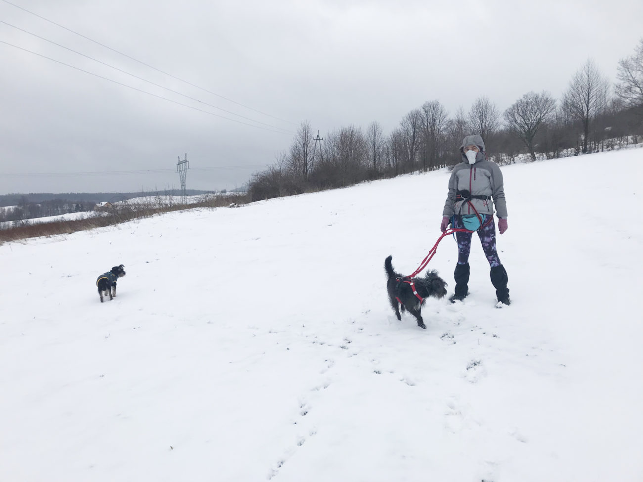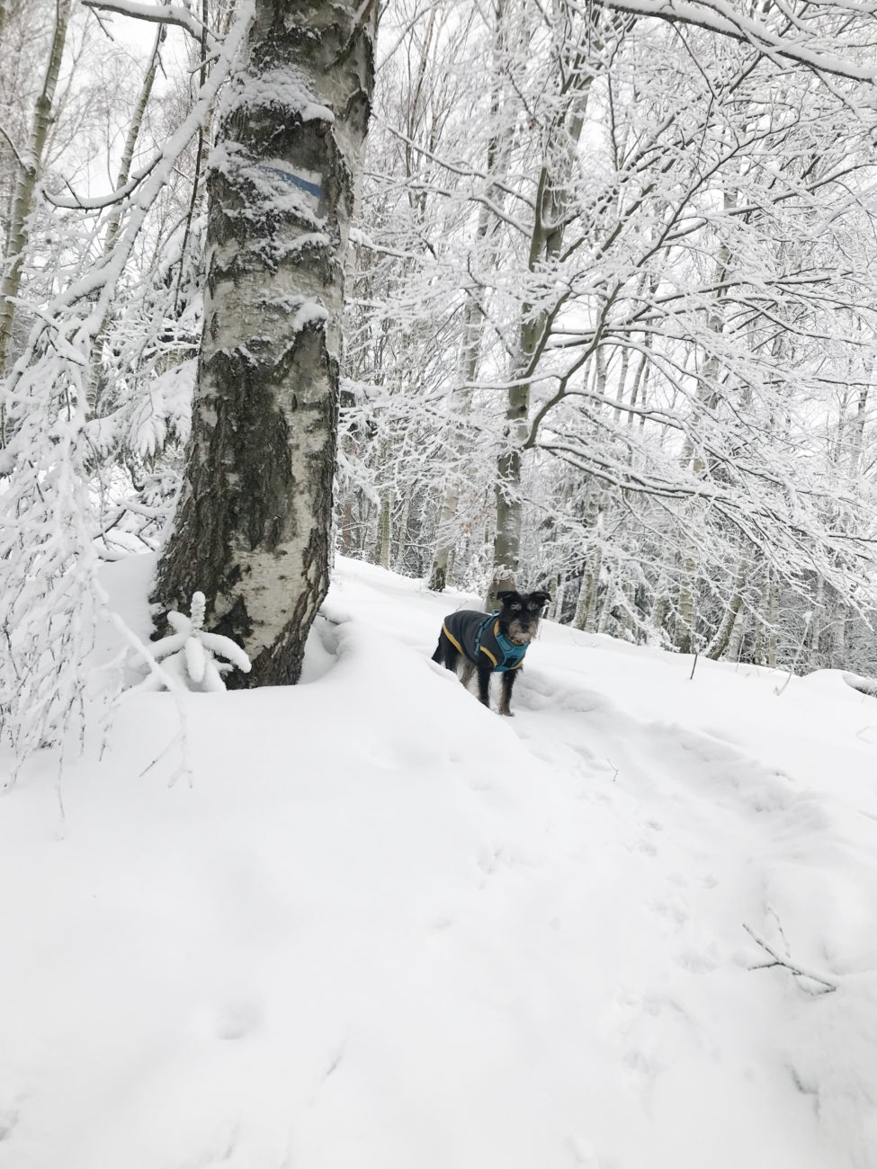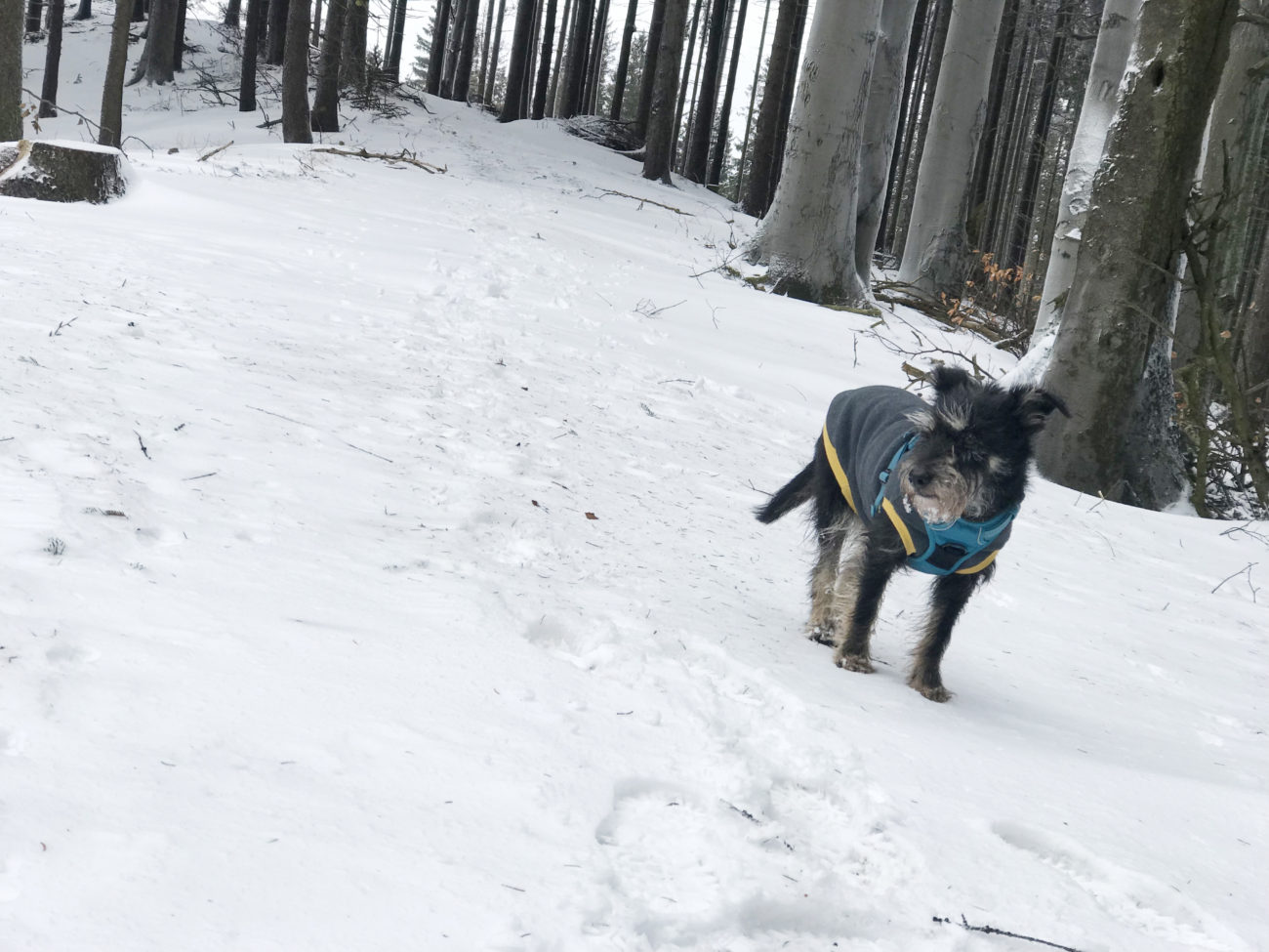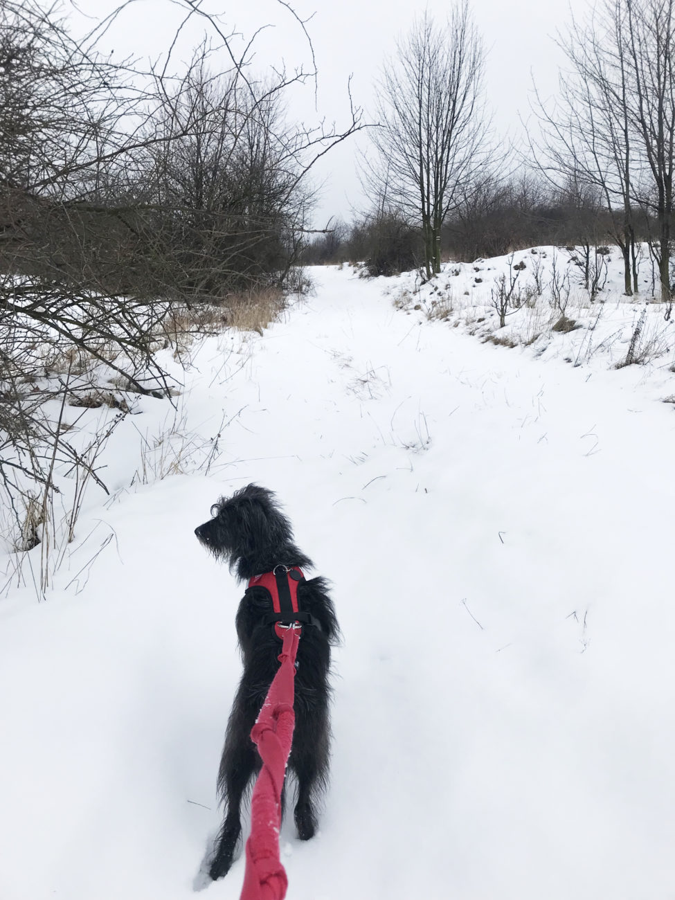 Od samego początku to my przecieraliśmy szlak. Miejscami śniegu było trochę więcej polecam więc na takie wypady mieć ze sobą sprzęt typu stuptuty, a i nasze mikroraczki coś się przydało. Nie mogę się doczekać już odbioru moich nowych raczków, wyłowionych ostatnio na jednej z promek. Bo ponieważ męska część stada za nic ma moje zabieranie jego stutów, prośby o ubranie ich to mu razem z Bu przyszło dreptać przodem , przecierać szlak, co by można było ość po naszych śladach oraz sprawdzanie głębokości pokrywy śnieżnej. Mówię Wam -miejscami było wyżej niż na stuty 🙂