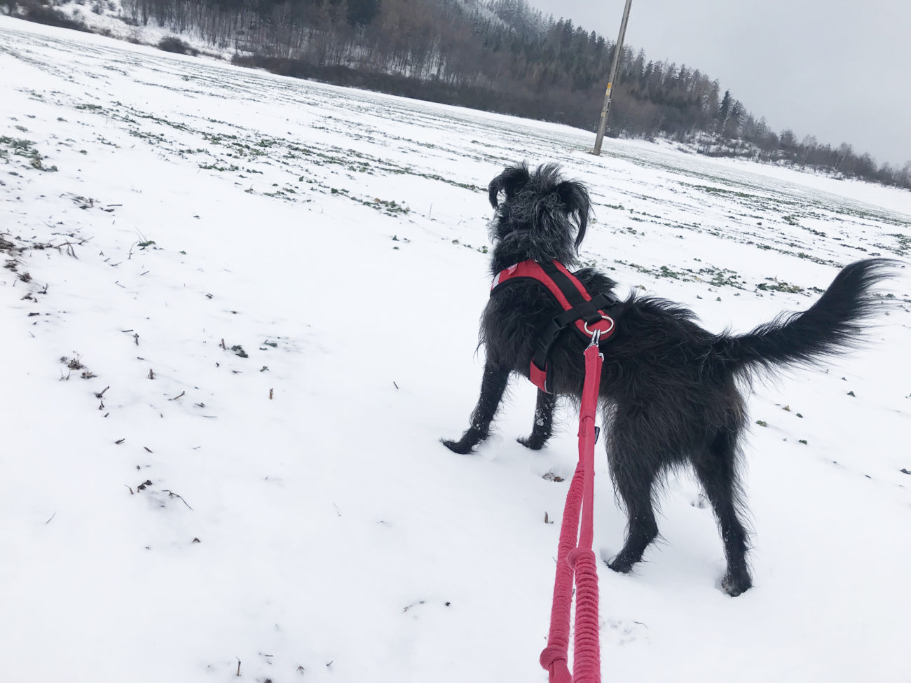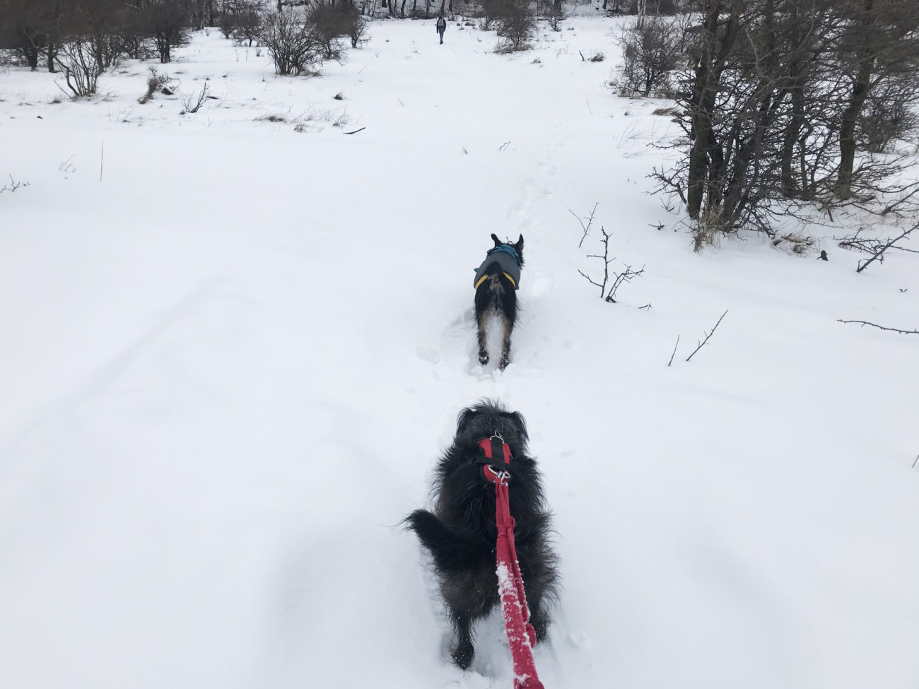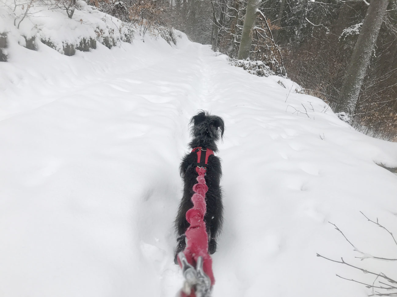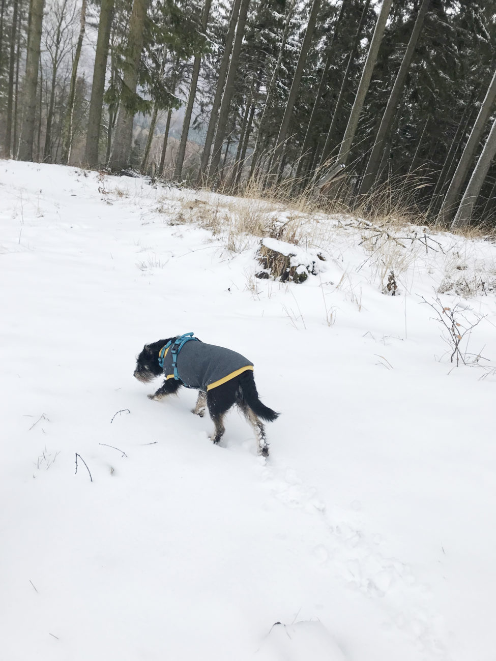 Od samego początku to my przecieraliśmy szlak. Miejscami śniegu było trochę więcej polecam więc na takie wypady mieć ze sobą sprzęt typu stuptuty, a i nasze mikroraczki coś się przydało. Nie mogę się doczekać już odbioru moich nowych raczków, wyłowionych ostatnio na jednej z promek. Bo ponieważ męska część stada za nic ma moje zabieranie jego stutów, prośby o ubranie ich to mu razem z Bu przyszło dreptać przodem , przecierać szlak, co by można było ość po naszych śladach oraz sprawdzanie głębokości pokrywy śnieżnej. Mówię Wam -miejscami było wyżej niż na stuty 🙂