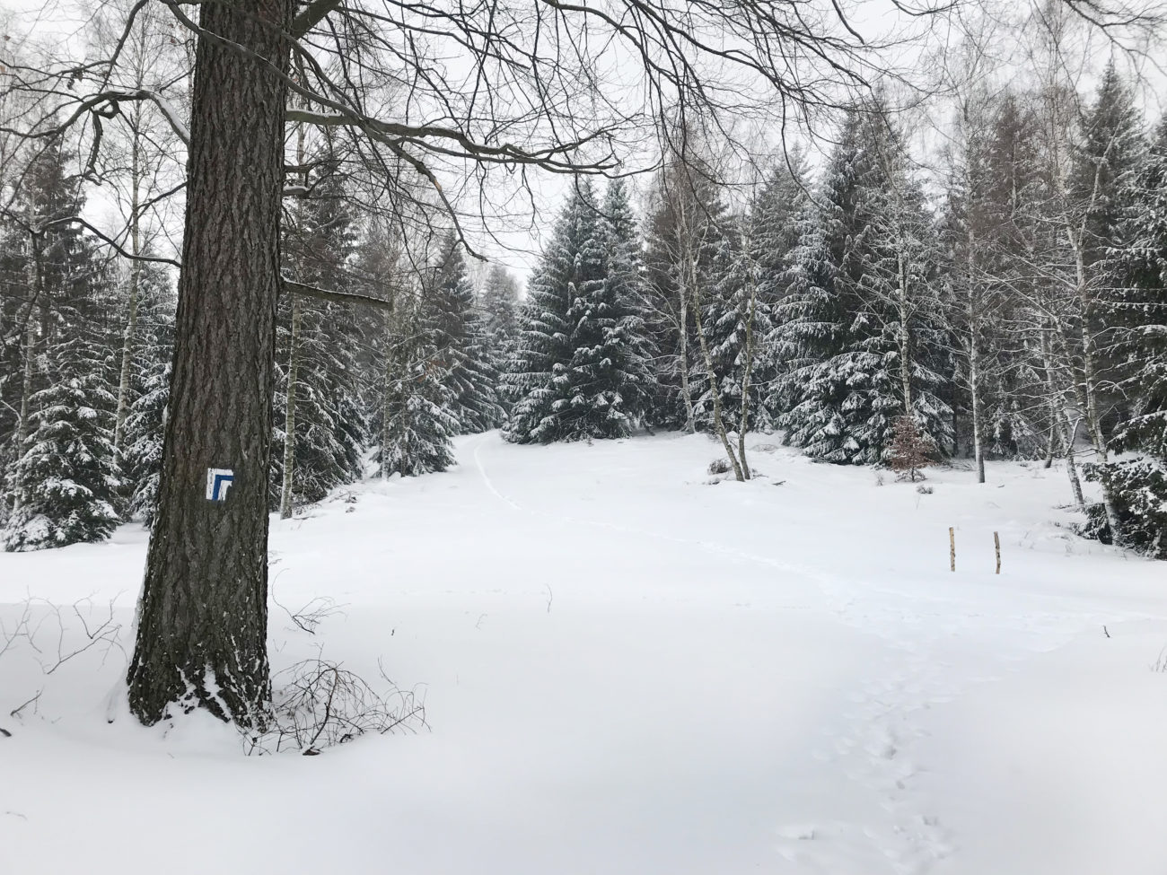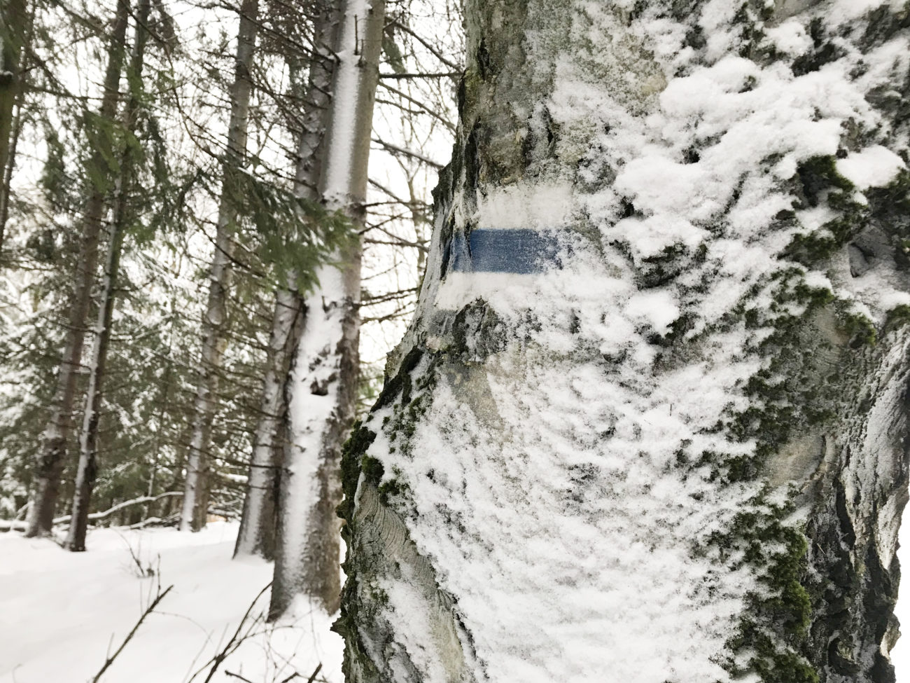 Zimowe wyprawy mają jeden minus- nie widać przebiegu ścieżek. Oznaczenie szlaku przez cały czas jest bardzo dobre, zwątpiliśmy jedynie na początku kiedy niebieskie znaczki zlokalizowaliśmy na słupach trakcji a przejście obok nich oznaczałoby przejście centralnie przez pole z jakimiś roślinkami. Dzielnie przelawirowaliśmy w miarę bokiem, potem już tylko ścieżka w górę, w górę  a potem bardziej w górę 😀