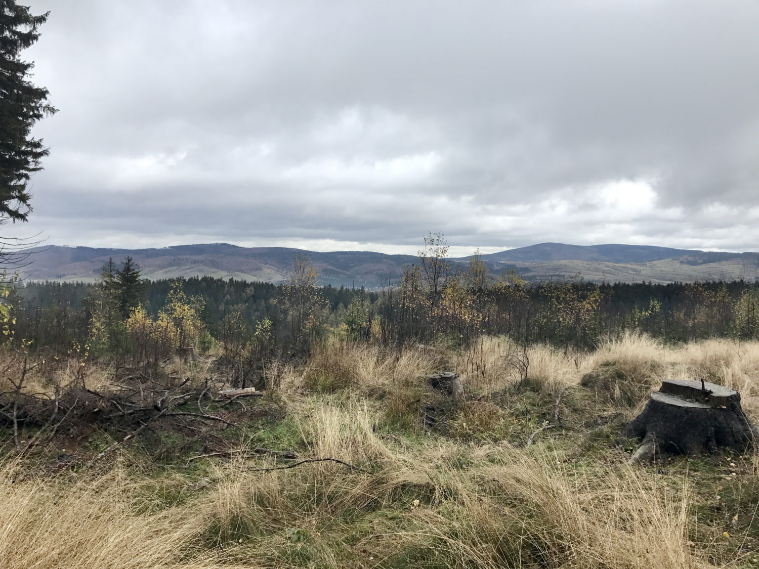 Trafiliśmy na efekty działania orkanu Grzegorz – powalone drzewa, prace drwali przy uprzątaniu połamańców i nasze domniemanie o złamanych drzewach z oznaczeniem szlaków. Tak więc zdecydowaliśmy się ominąć wycinkę trochę na dziko, szukając znikającego szlaku, idąc w górę. Tym sposobem trafiliśmy na szlak, zielony, który podobno był niżej bo przez chwilę nim szliśmy 🙂 który doprowadził nas wprost na Kruczą Skałę.