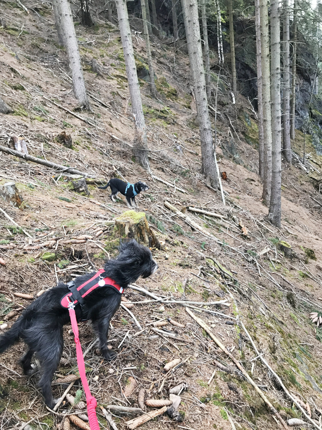 Naszą trasę zaczęliśmy porzuceniem białasa pod Kalwarią – zjazd w zatoczkę przy drogowskazie na skocznie narciarską (jadąc od Chełmska Śląskiego po lewej stronie). Stamtąd ruszyliśmy szlakiem zielonym przez Rezerwat Kruczy Kamień. Mieliśmy plan zrobić pętlę przez punkt widokowy na Kruczym Kamieniu, do Rozdroża Trzech Buków i wrócić zielonym przez Płoninę. Posiadamy mapę wydawnictwa Galileos. Niestety w moim ulubionym sklepie z mapami we Wro, swoją drogą psiolubnym, przy ulicy Wita Stwosza, to jedyna mapa tych gór, tak więc nie wydziwiałam przy zakupie, ale ten spacer utwierdził mnie w przekonaniu żeby mapę owszem – zabierać, ale polegać bardziej na odczytach GPSa.