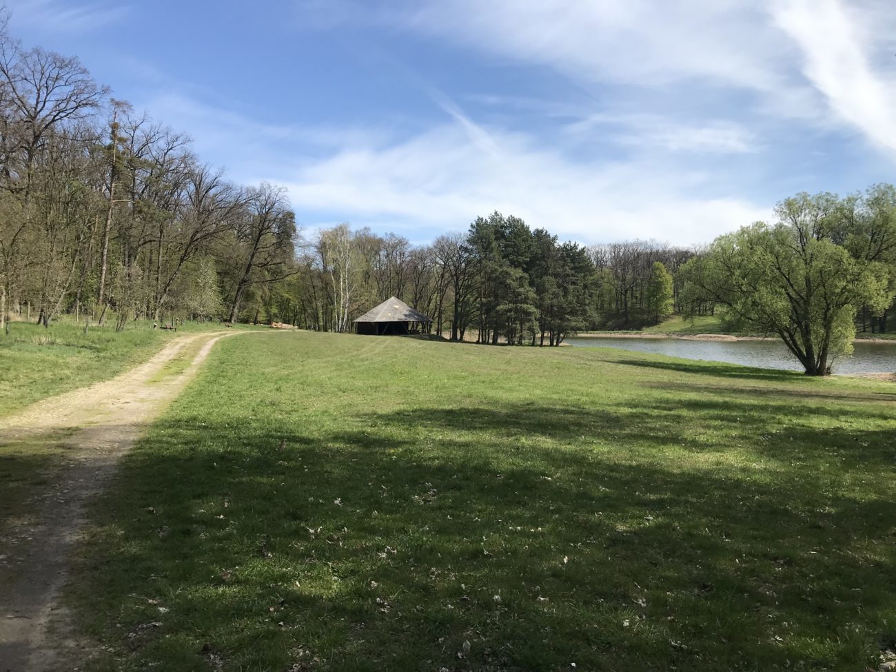 Na początek, rozruchowo rzuciliśmy się na spacer wzdłuż brzegów Jeziora Gołuchowskiego. Jest tu leśny parking, można porzucić piesowóz i podreptać na dłuuugi spacer.