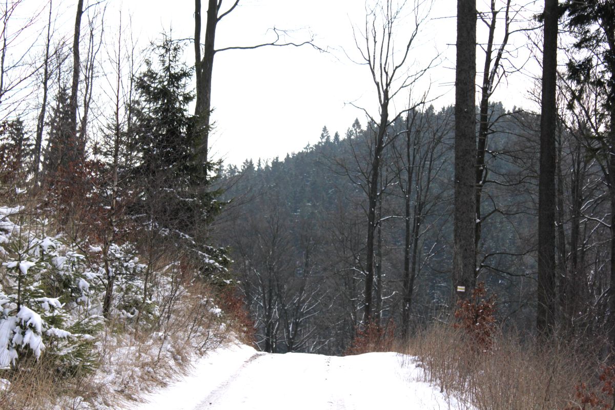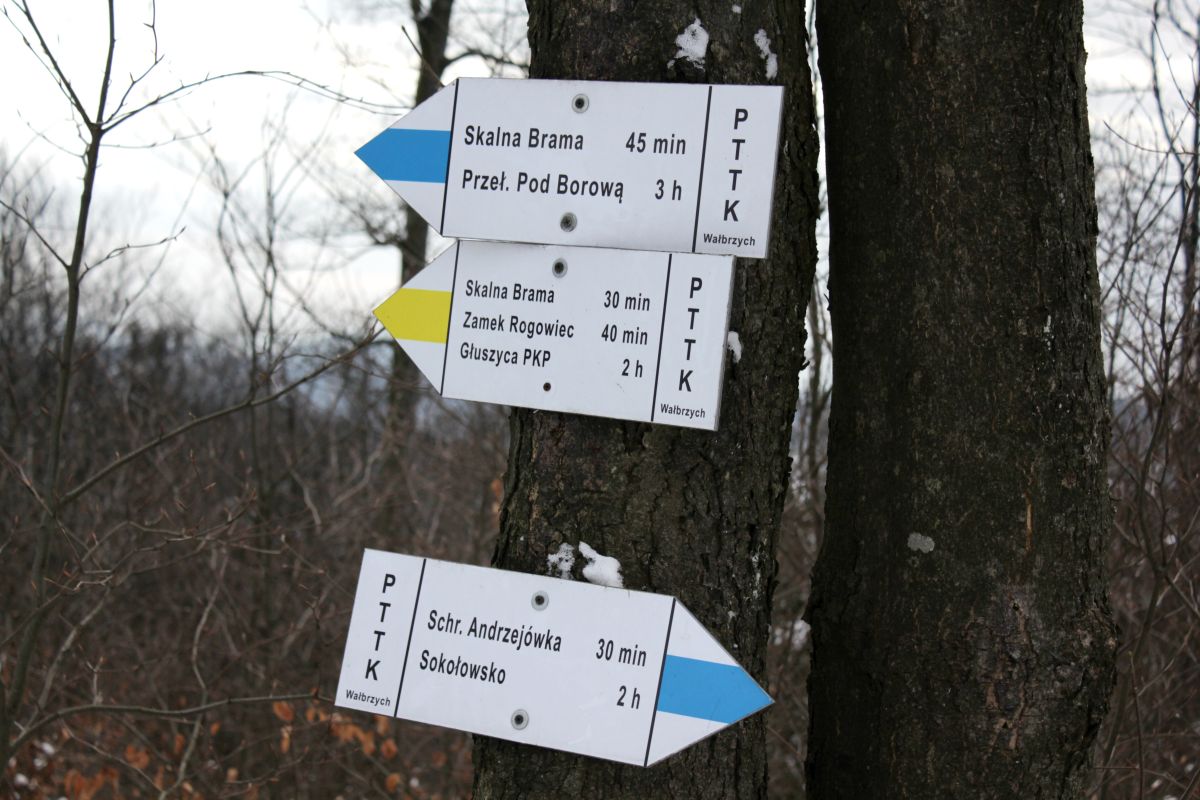 (Szczytować jak widać się da, trzeba tylko zwrócić uwagę na oznaczenia, bo może się okazać,że przejdzie sie przez któryś ze szczytów nie zauważając tego faktu. ot, takie plaskate szczyty. Trasę wyznaczyłyśmy sobie tak, by w połowie wypadu zrobić koło i wrócić do Andrzejówki. To wtedy postanowiłyśmy spróbować czy ogony przemkną niezauważone pod stół a my skorzystamy z uzupełnienia ciepło-napojowego. Napite i ugrzane mogłyśmy podreptać w stronę Sokołowska)