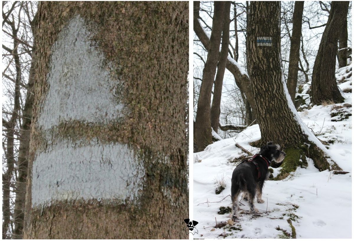 (Z Zamku weszłyśmy na szlak niebieski – trzeba się przyjrzeć, żeby znaleźć wejście na niego- nie drogą, a ścieżką ostro w górę. To było chyba najbardziej strome podejście jakie miałyśmy po drodze, ale że było krótkie, nie można go liczyć jako udręczanie się)