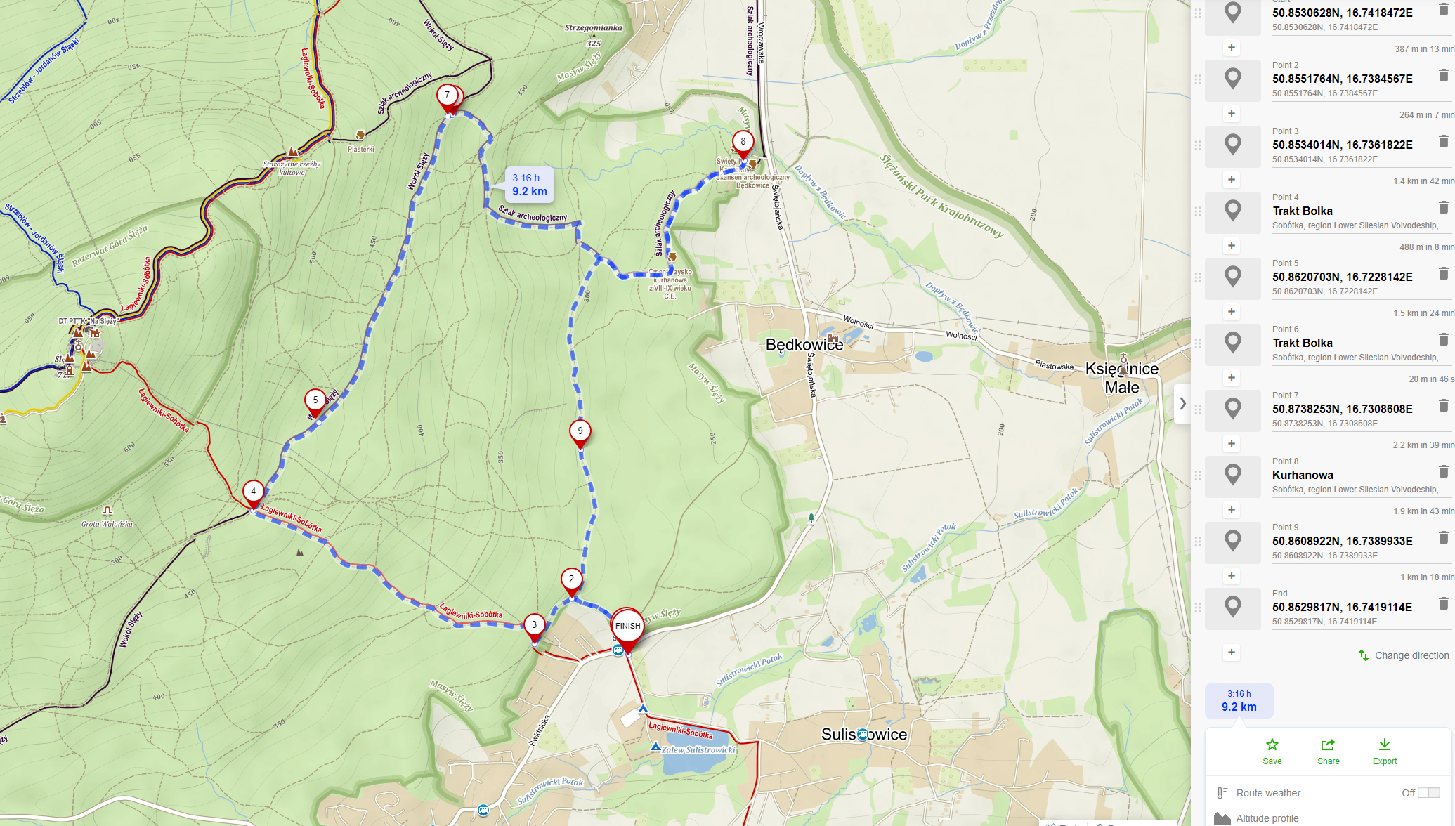 Tak zrobiliśmy teraz. Zostawiam Wam trasę, która mimo, że nie zalicza samego szczytu Ślęży, dostarczy Wam nie tylko przyjemność z deptania po pięknych ścieżkach, ale i pozwoli liznąć historii tego niezwykłego miejsca. Przed Wami trasa zahaczeniem o Będkowice , czyli