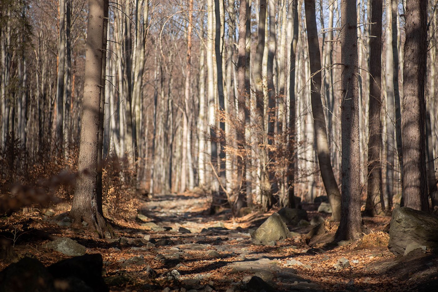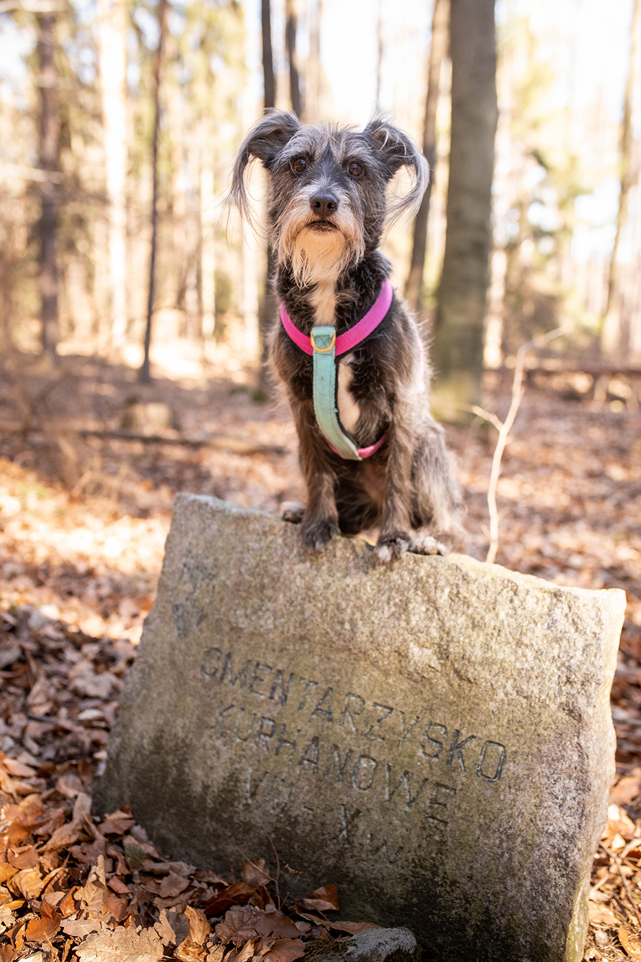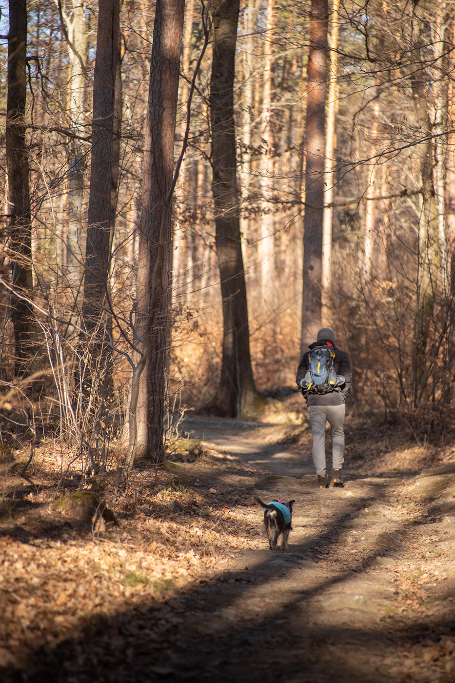 Tu zostawiliśmy piesowóz, przekroczyliśmy szosę by wpaść do lasu. Początkowo ścieżką, późnej szlakiem czerwonym, powoli pnąc się w górę. Jeśli wybierzecie taką pętelkę jak my, kończąc na historycznych punktach , początek wyprawy to delikatna wspinaczka. Podejście nie jest mordercze, ale przyjemnie rozgrzewa na wstępie. Drepczemy po dobrze utrzymanych , szerokich duktach więc niezależnie od pory roku nie będzie tu problemu z wędrowaniem.