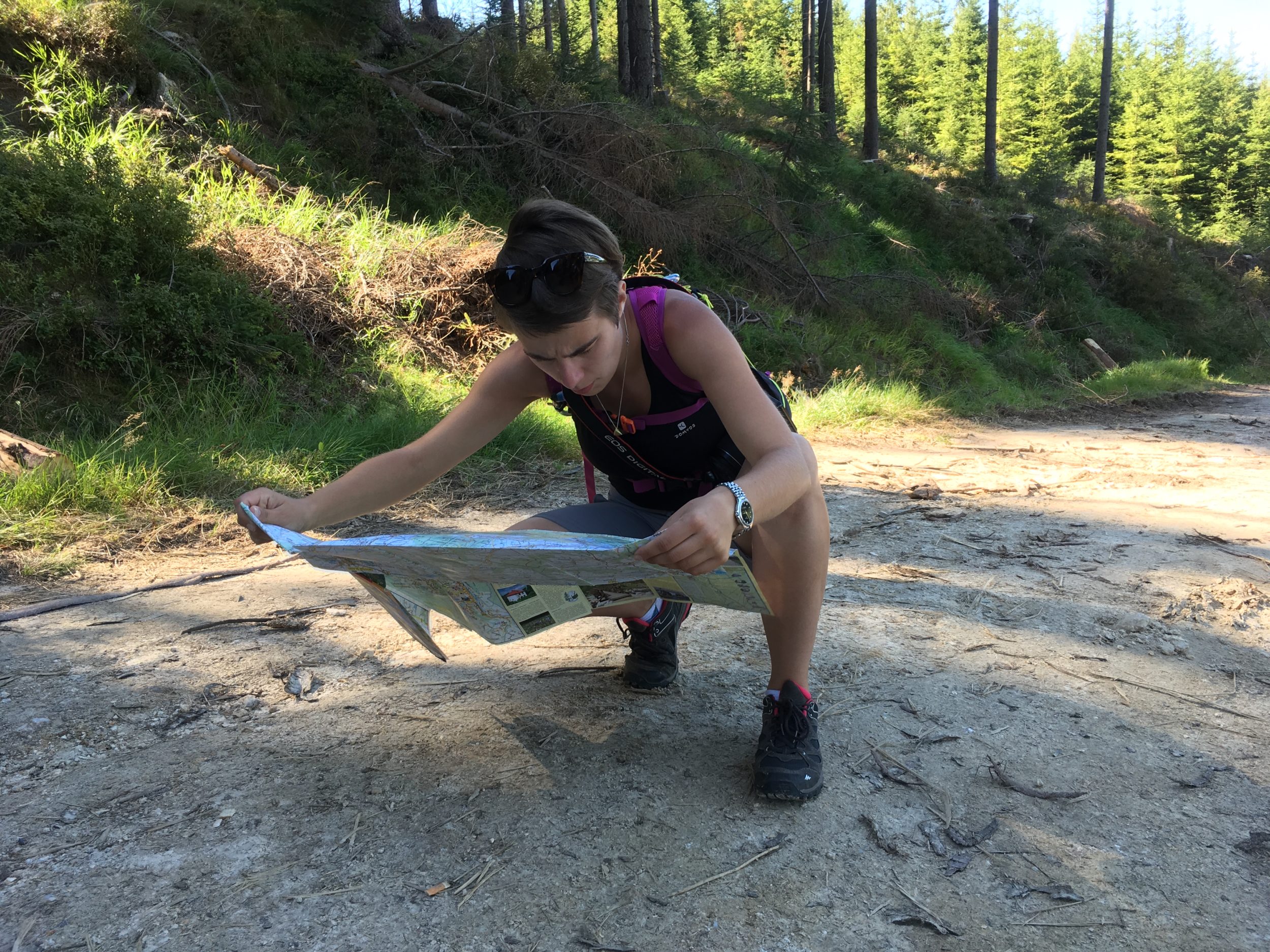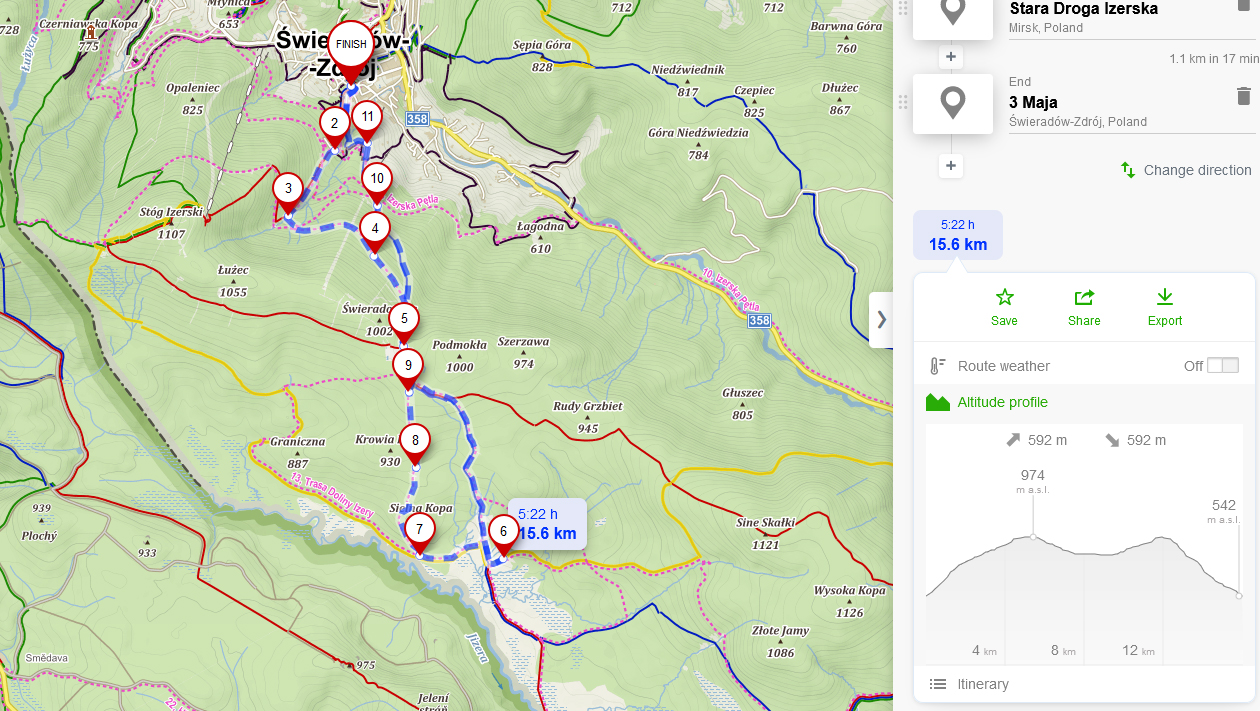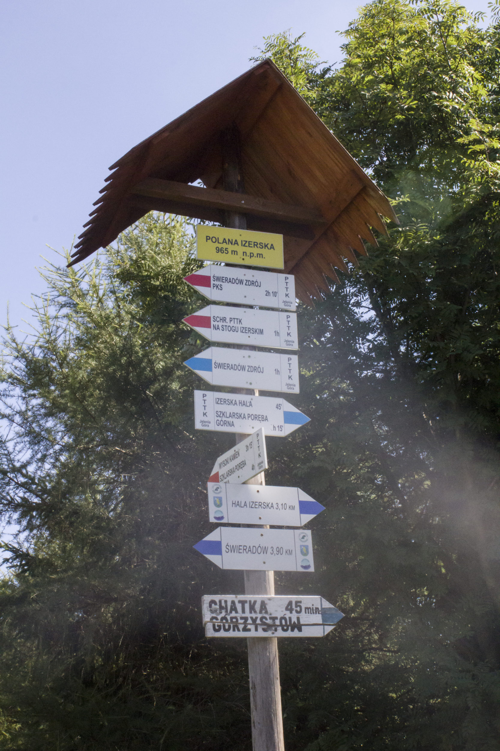 Auto zostawiliśmy na bezpłatnym parkingu w Świeradowie, koło Domu Zdrojowego, na ulicy Konstytucji 3 Maja. Stamtąd weszliśmy na szlak czerwony, kierując się na GOT Czeszka i Słowaczka, aż do rozwidlenia tegoż szlaku z trasą rowerową ER-2. Wybraliśmy spacer rowerowy, jest to trasa zdecydowanie bardziej „lajtowa”, czyli wszytko w myśl urlopowania. Szlak czerwony i trasa rowerowa schodzą się ponownie na Polanie Izerskiej, więc w tym wypadku niezależnie czego by nie wybrać i tak „wyrzuci” nas w tym samym miejscu 🙂