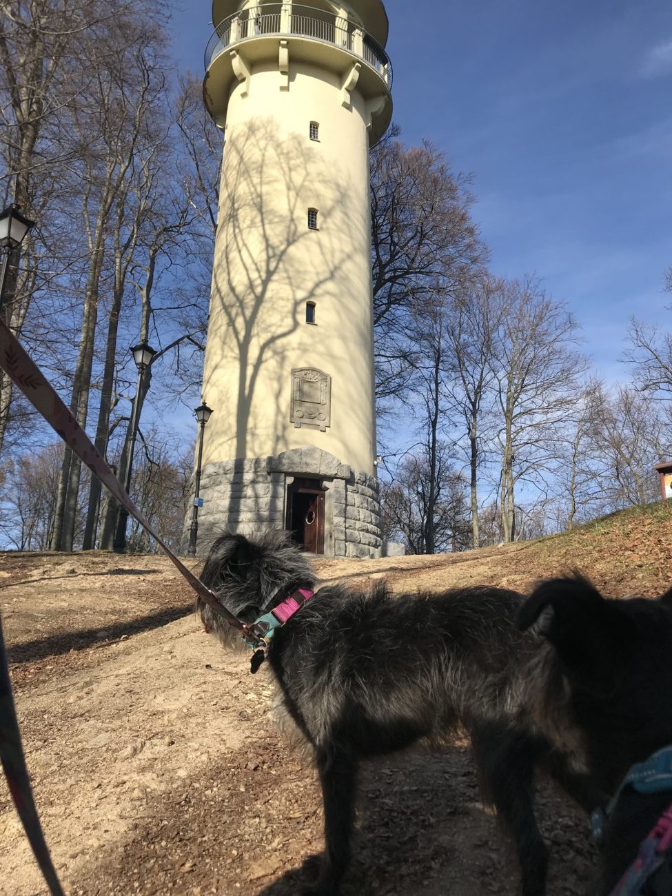 Żeby sucze grzecznie zaległy w kawiarni należało je jeszcze troszkę pomęczyć spacerowo. Lubię widoczki, więc na celownik wzięłyśmy Wzgórze Krzywoustego z wieżą widokową. Piesowów zaparkowałam zaraz pod górką (mapka) , skąd można wejść na górę szlakiem , szybciej i ostrzej, lub spokojnie na około .