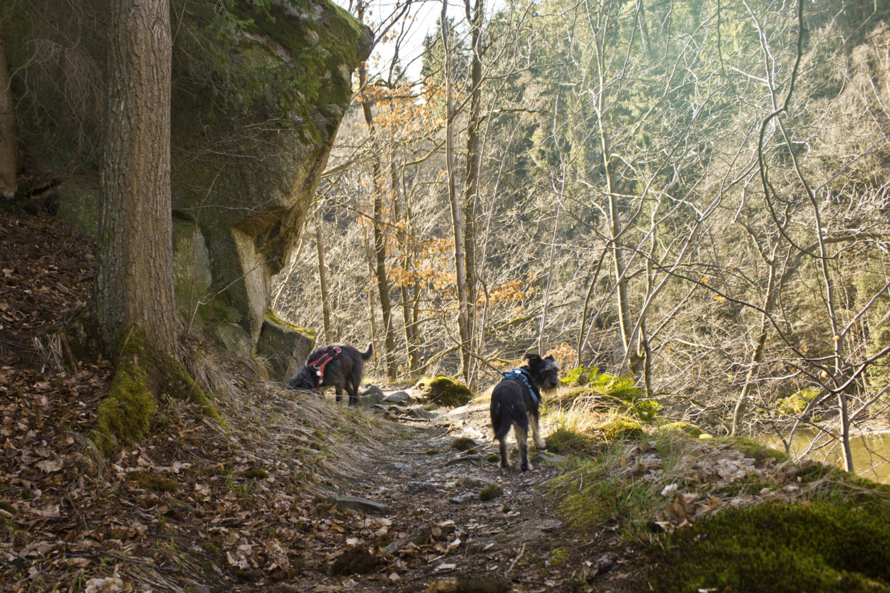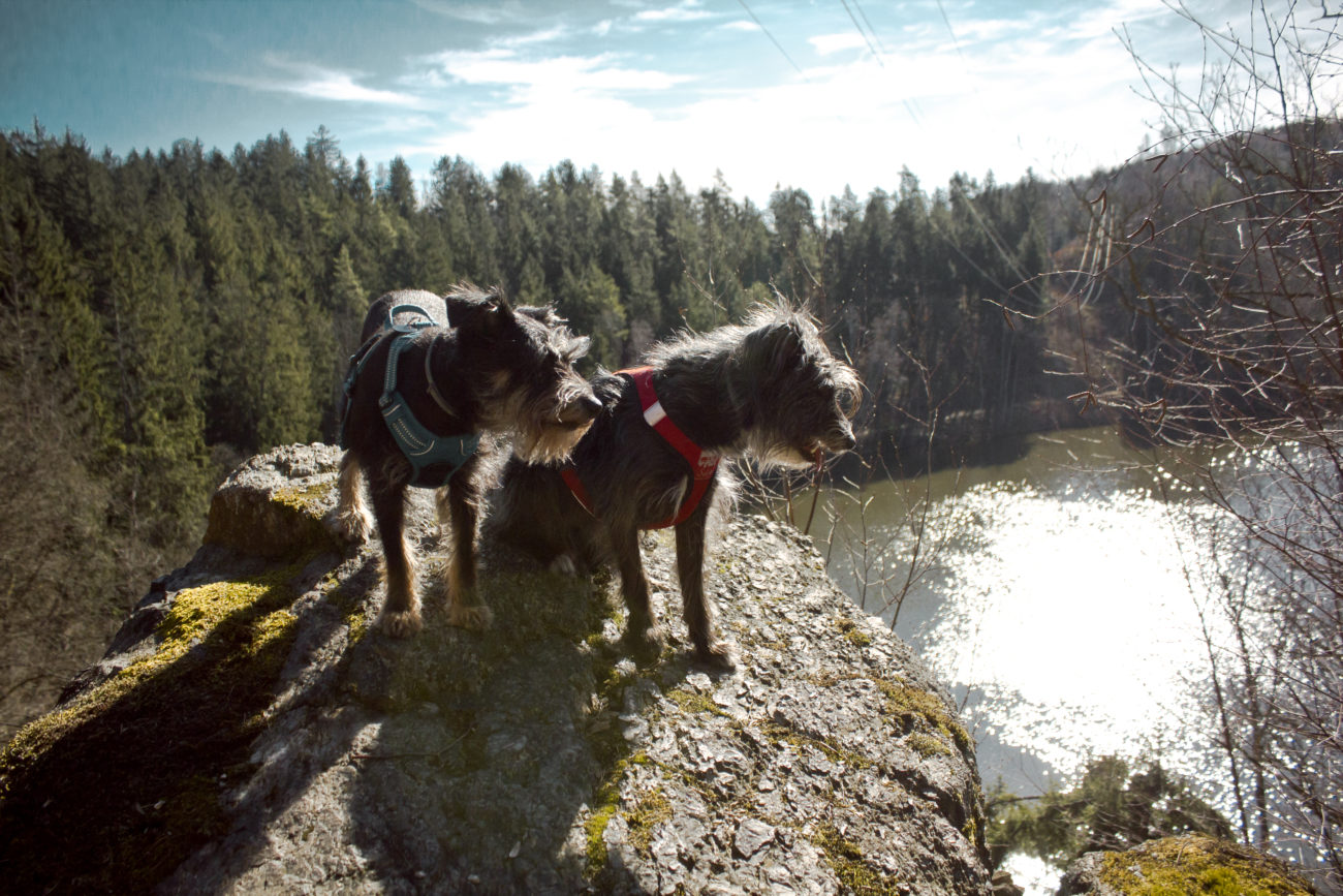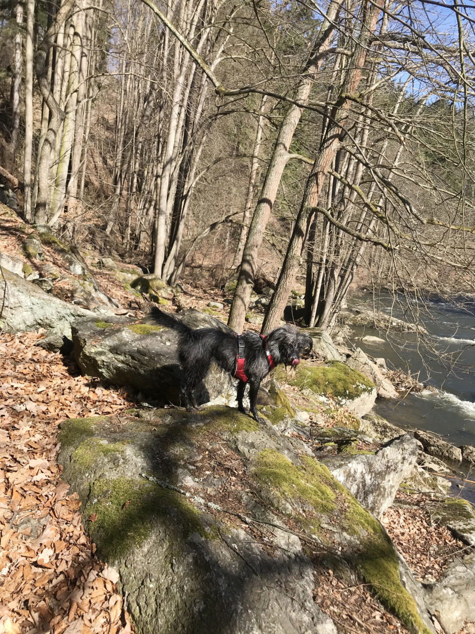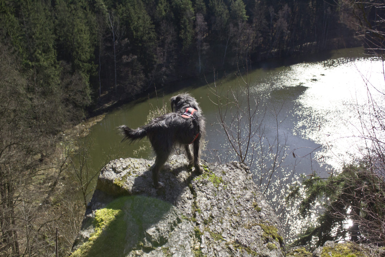 Jak już się uda nasycić widokami i przestrzenią, można ruszać dalej. My wybraliśmy przejście wzdłuż rzeki. Trafiliśmy na względne pustki, futra miały okazję pomoczyć łapki, minęliśmy kilka przyjemnych zejść do wody. Szkoda tylko, że w rzece pływała taka koszmarna ilość śmieci :/ Ścieżka prowadzi łagodnie , nie można narzekać na podejścia. Idealny wybór jeśli chce się wyrobić kilometry, ale przy okazji popaplać, bez zagrożenia zacharchaniem się z zadyszki 😀