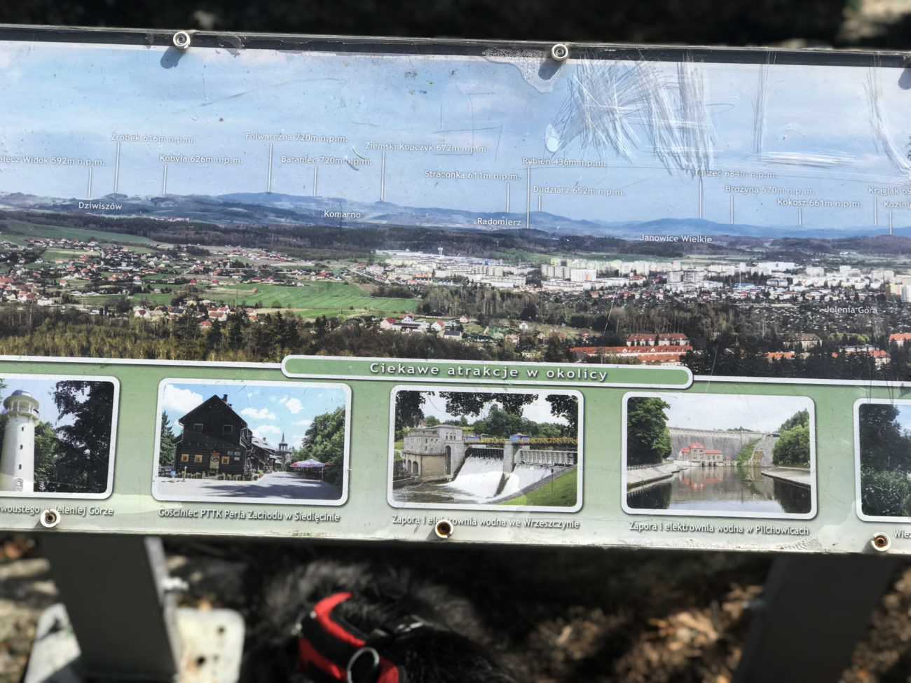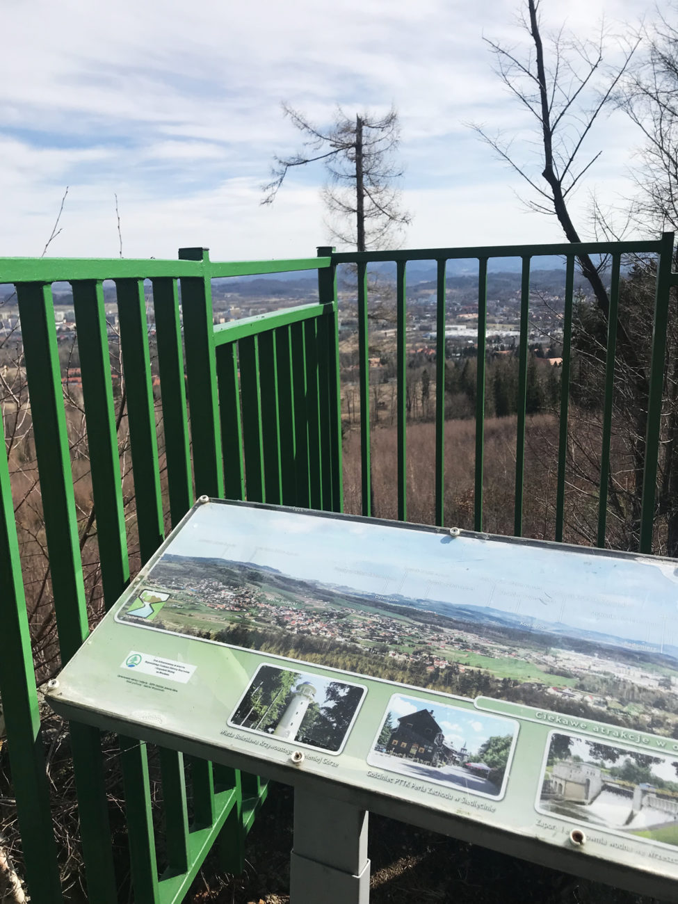 Znowu bez szalonych podejść . Ścieżka sobie spokojnie podchodzi pod górę, a my mijamy kilka tabliczek kierujących na Gapy (470 m n.p.m). Trzeba się na koniec trochę rozejrzeć, ale jest to warte zachodu. To jest PUNKT WIDOKOWY na miarę naszych potrzeb 😀 Wejście na skałki (tak,jest tu kesz 😉 ) z których rozciąga się piękny, daleki widok. Dodatkowo tablica z opisem na co się tak po prawdzie gapimy. W sam raz dla takich jak ja, którzy mają problemy z rozpoznawaniem szczytów .