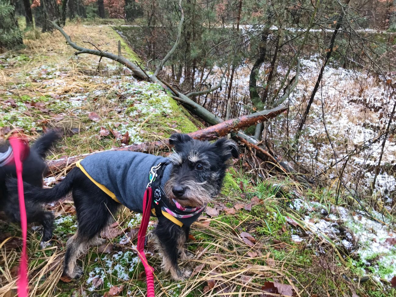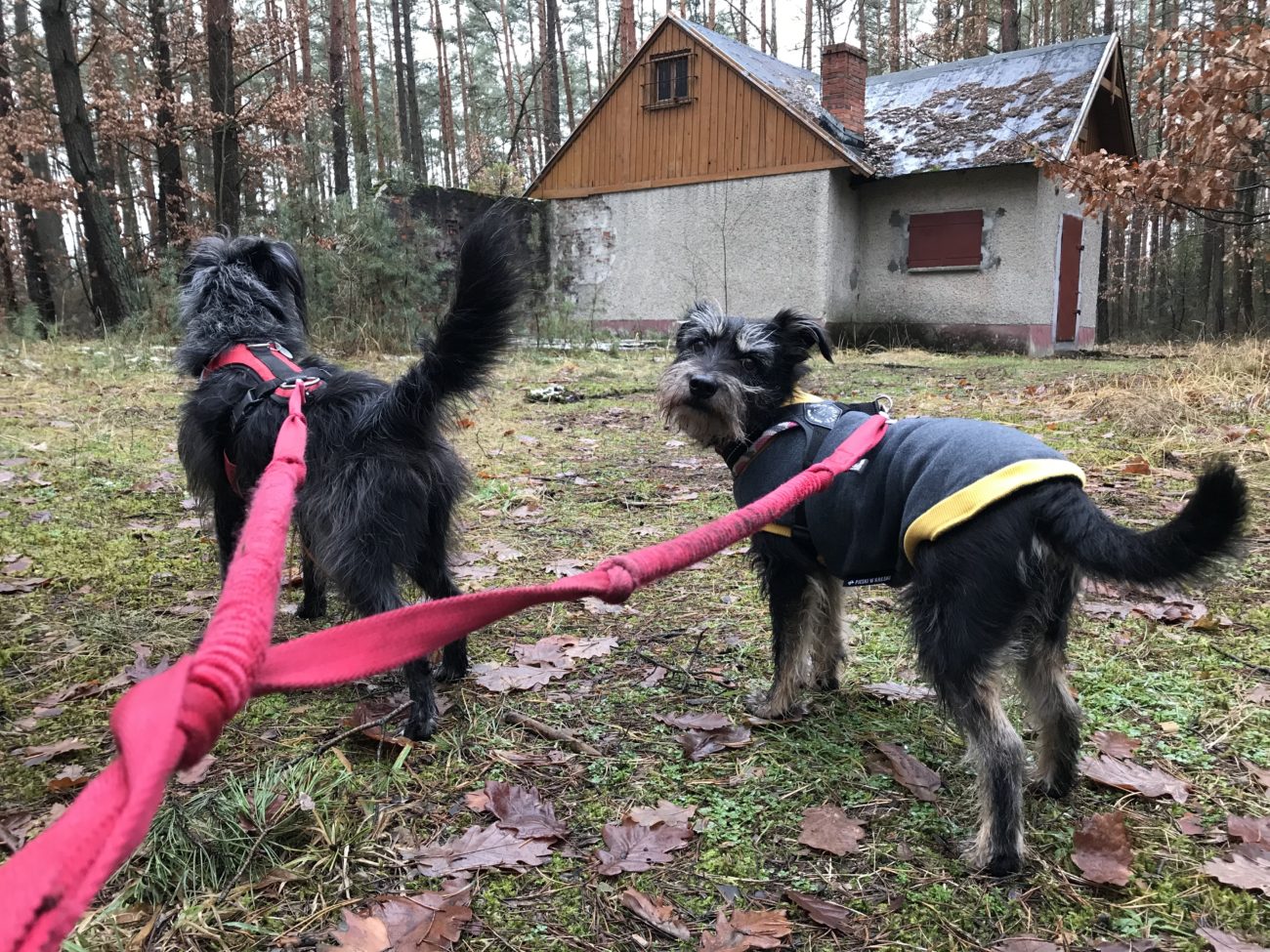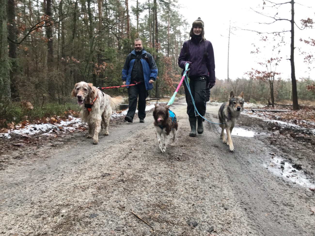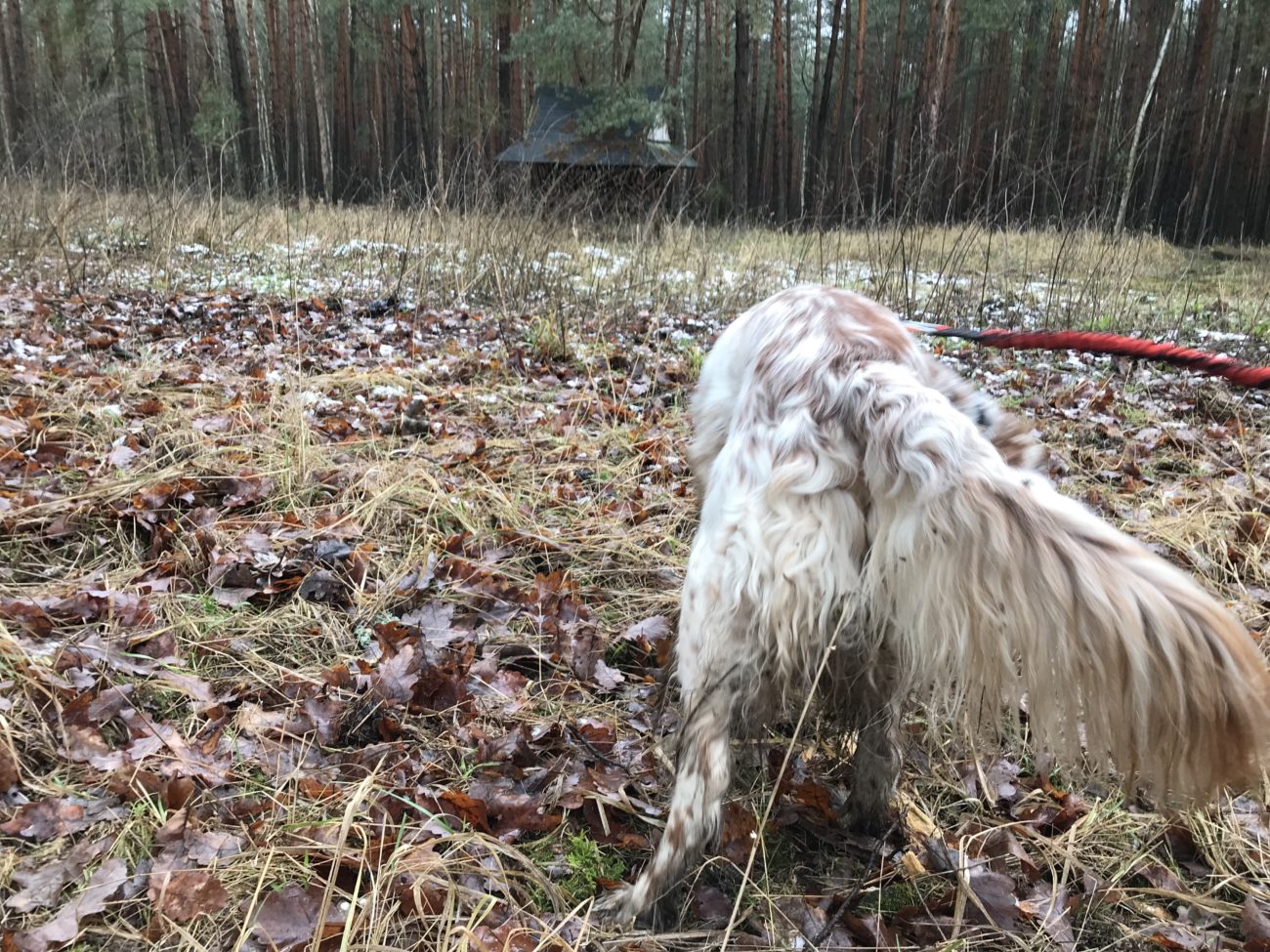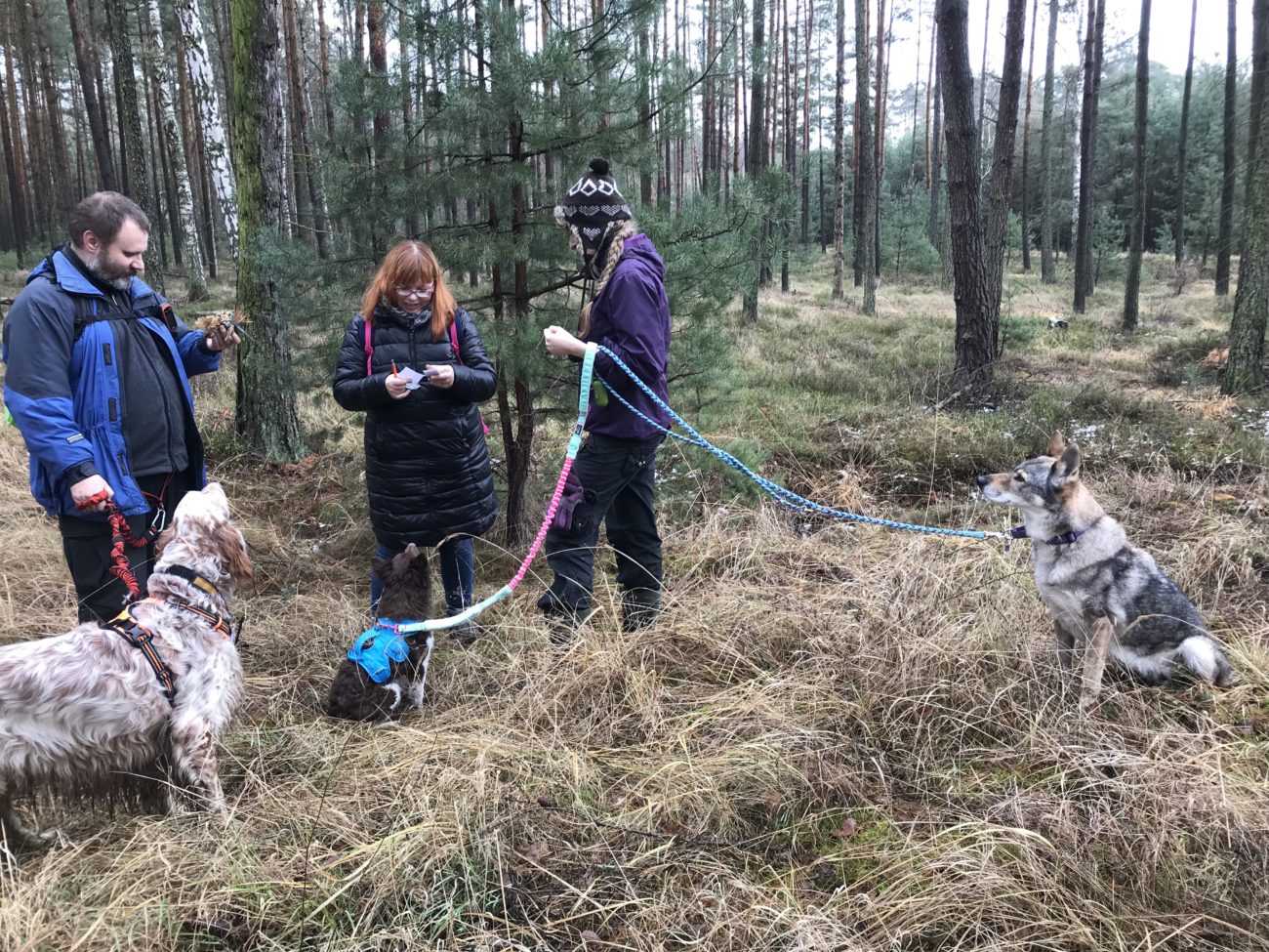 Nasz spacer skrócony przez deszczową pogodę to pętla ok 10 km. Oczywiście natknęliśmy się na polowanie więc szczególnie teraz należy bardziej uważać na siebie i psy. Kolorowe ciuchy albo odblaskowa kamizelka, szczególnie przy takiej burej pogodzie jak ostatnio i bieganiu po krzakach to dobry pomysł. O psach na smyczach nie wspominając 🙂 bawmy się, ale jak najbezpieczniej:)