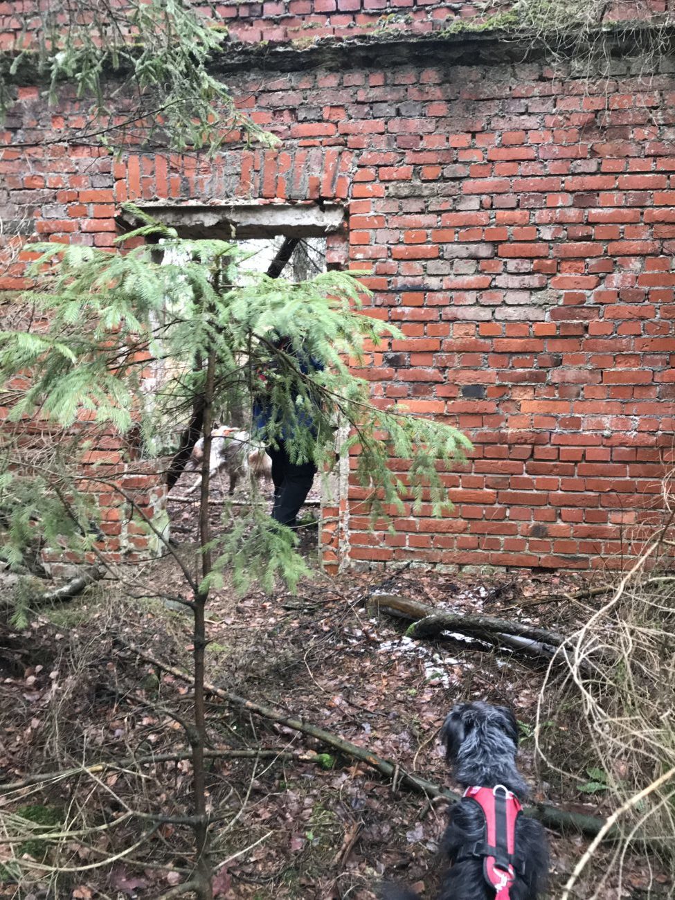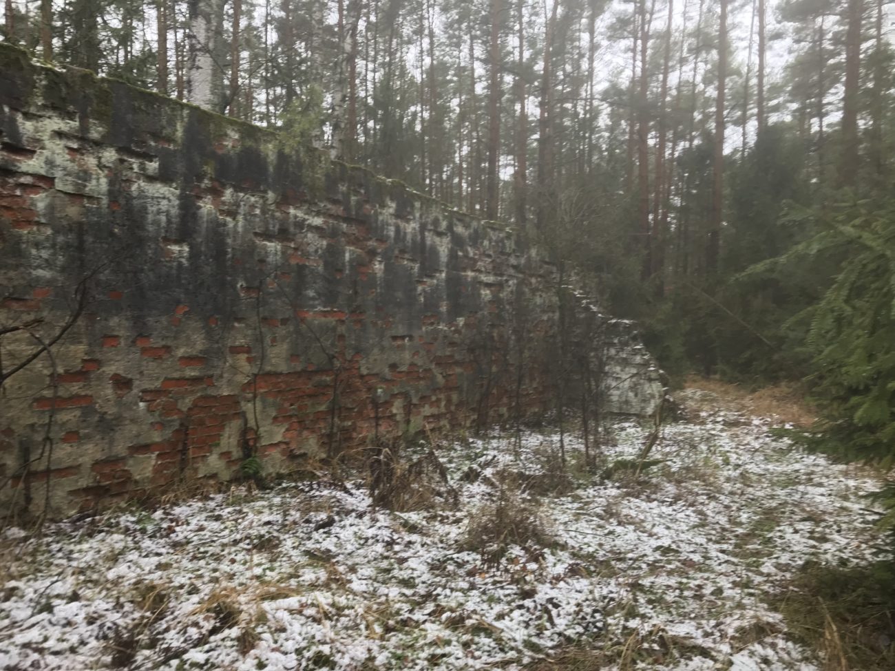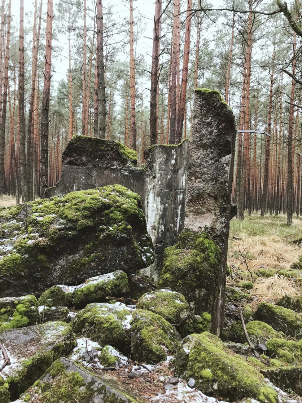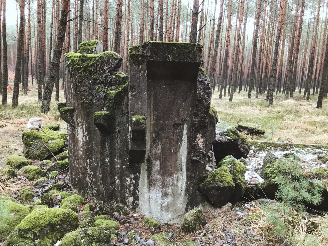 Wyprawę kończymy zatem nie zdobywając jeszcze wszystkich miejscówek w okolicy, szykuje się szybki powrót. Na sam koniec zdobywamy pozostałości poligonowej wieży obserwacyjnej. Zapożyczając garść informacji z geocachingu: wieżyczka wysadzona w latach 50tych przez polskich saperów w czasie rozminowywania poligonu. Niewiele zostało z wieży, ale i tak możemy sobie wyobrazić i jej rozmiar ze szczątków jak i sił wybuchu, który ją zniszczył. Uwaga na pozostałości zbrojonego betonu, zwłaszcza jeśli przykryje go śnieg