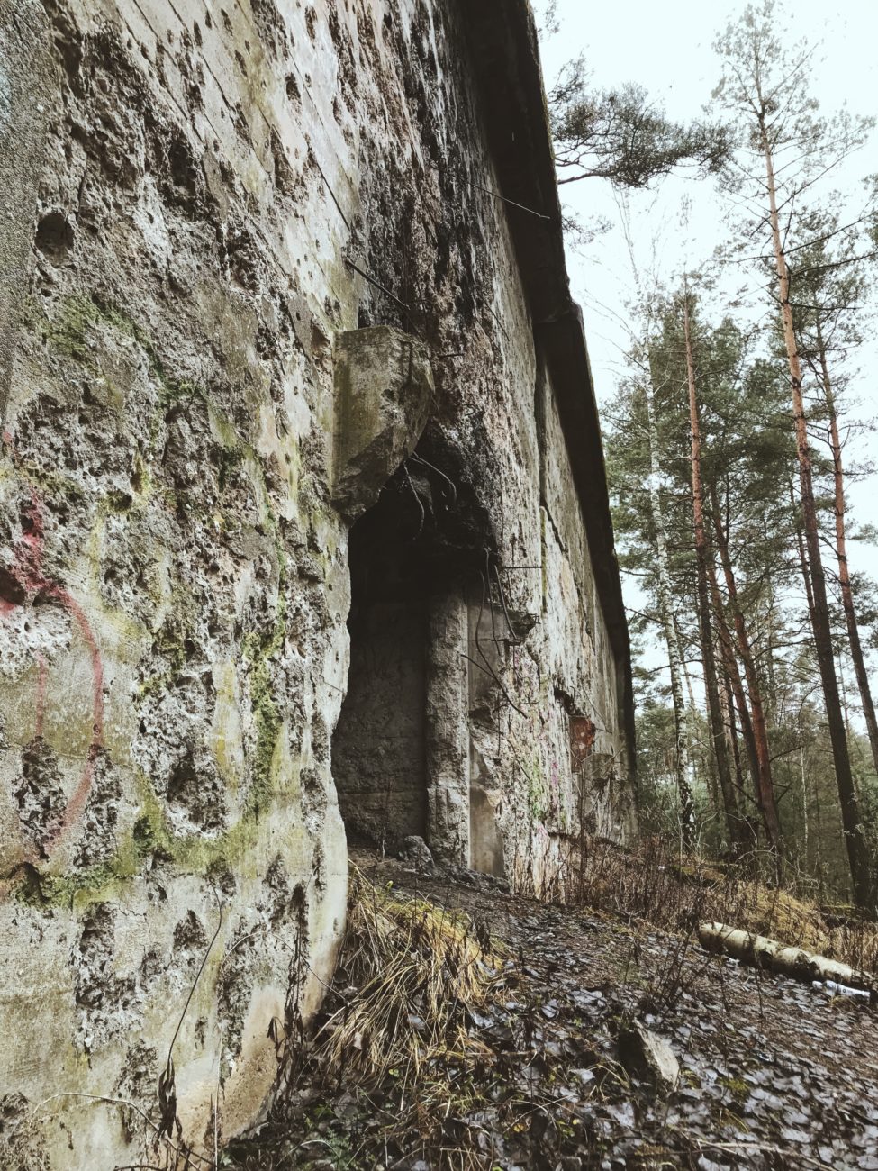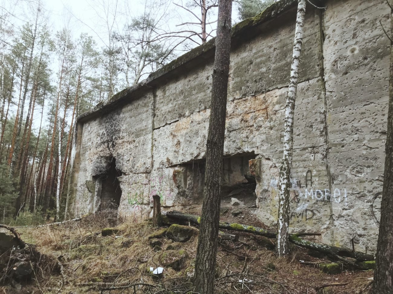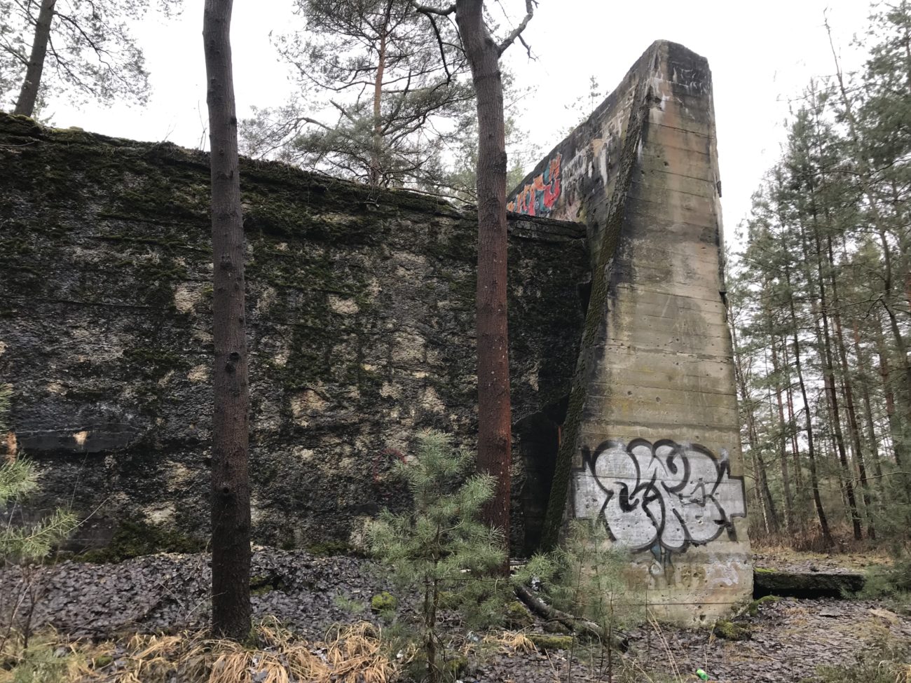 Niestety nie wszystkie oznaczone na apce czy mapce skrytki nadal istnieją. Dobrze przeczytać komentarze internetowo/apkowe z których niestety dowiedzieliśmy się, że niektóre które moglibyśmy „złapać” zostały zniszczone. Pozostaje czekać i liczyć, że ich twórca zdecyduje się na odnowienie. Ale mimo to znajdujemy pokaźny betonowy (zaskok ? ci to mieli tego betonu kurczę niezły zapas…) budynek. według jednego info z opencachingu dawny, zapomniany bunkier, po pogrzebaniu w poszukiwaniu dalszych info- kulochwyt przyzakładowej strzelnicy testowej, co wyjaśnia ilość betonu. Na mnie robi duże wrażenie, spacerując po lesie nie spodziewamy się zazwyczaj znaleźć czegoś takiego.