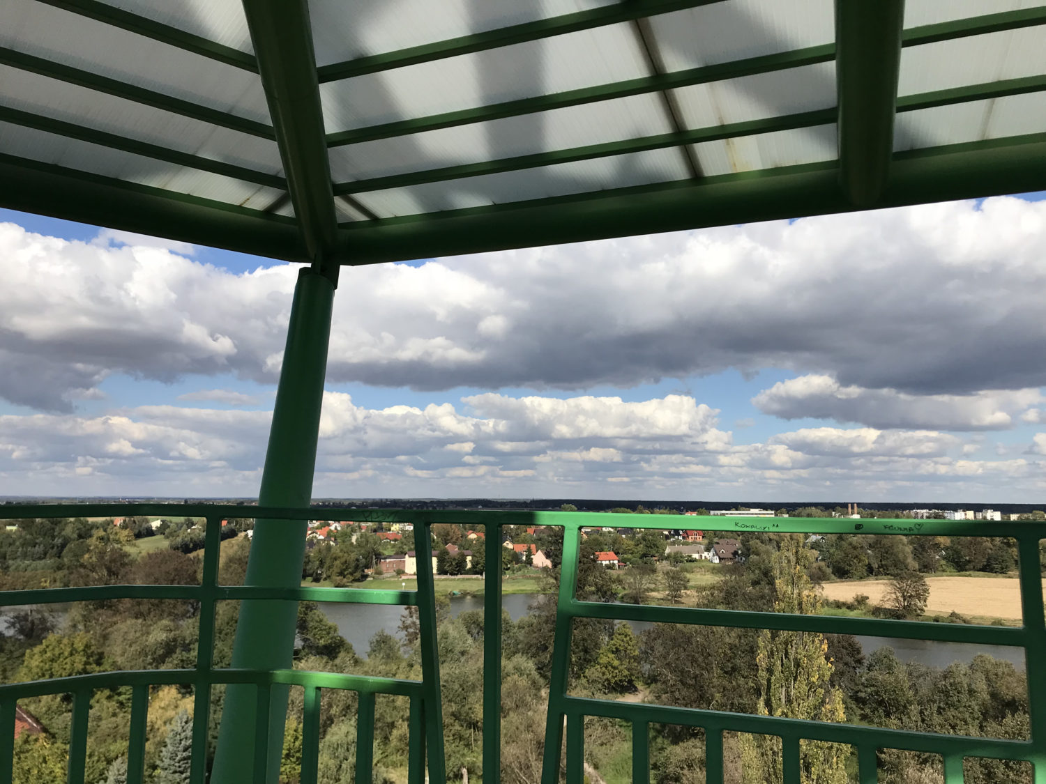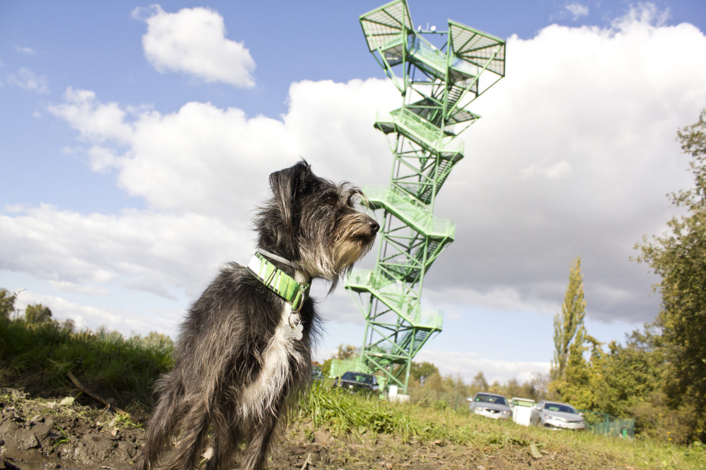 Do wieży dochodzimy szybko. Wstęp niepłatny, ale po raz kolejny nie jest to miejsce dla psich łapek – kratownica. My wspinamy się na zmianę. Widok wart przejścia wszystkich tych stopni! Wieża ma trzy tarasy widokowe z których rozpościera się cudny widok. Poza aglomeracją wrocławską i Ślężą i całymi terenem Natura 2000, ale też Wzgórza Strzelińskie, a nawet lekki zarys Sudetów 🙂