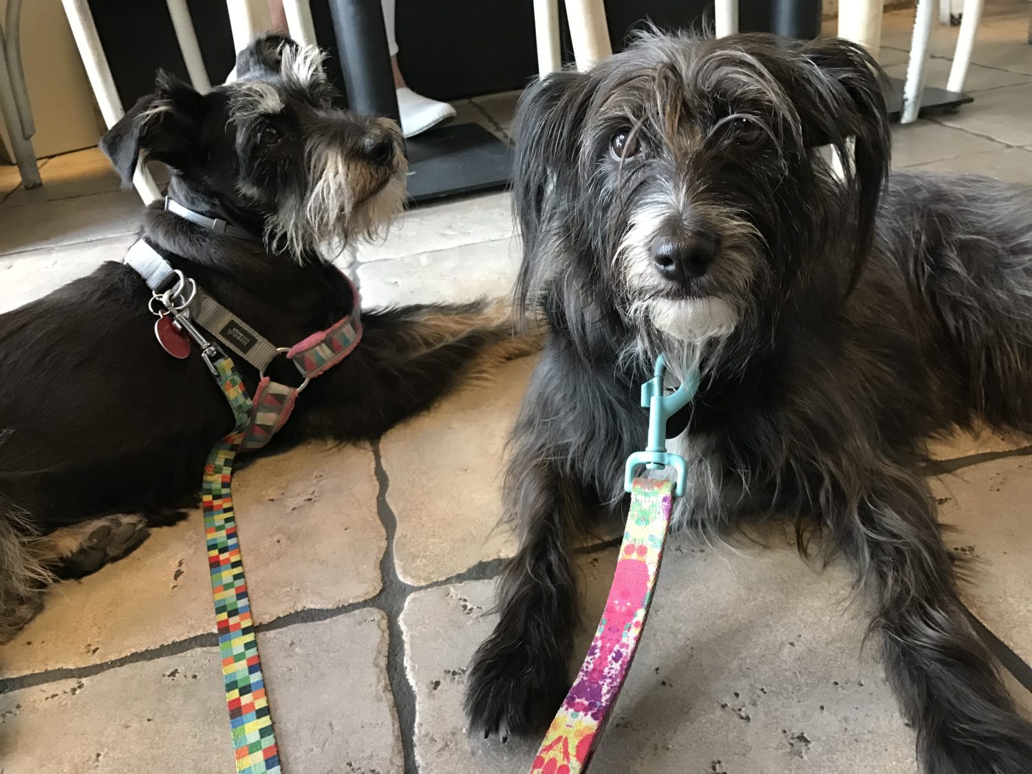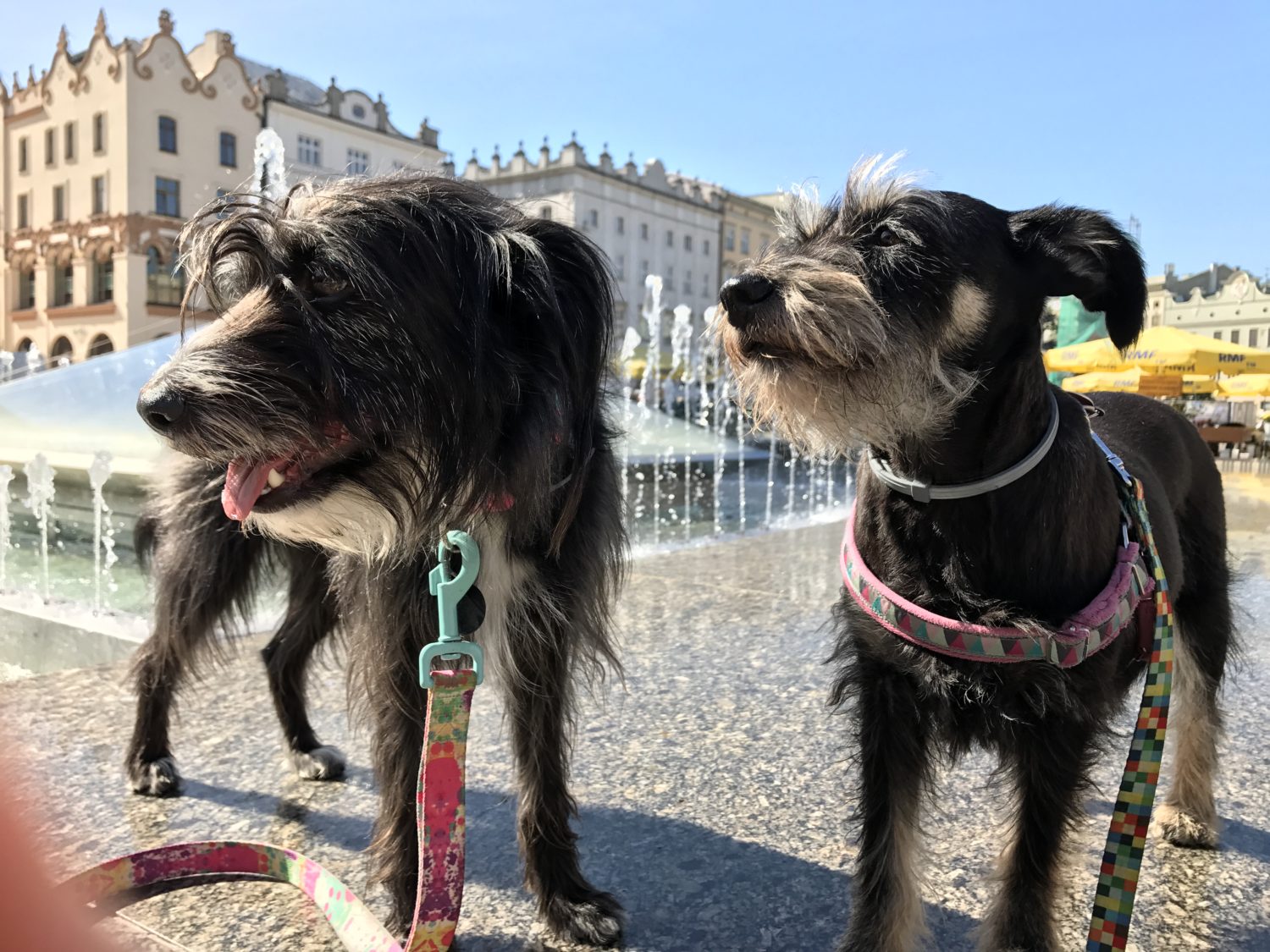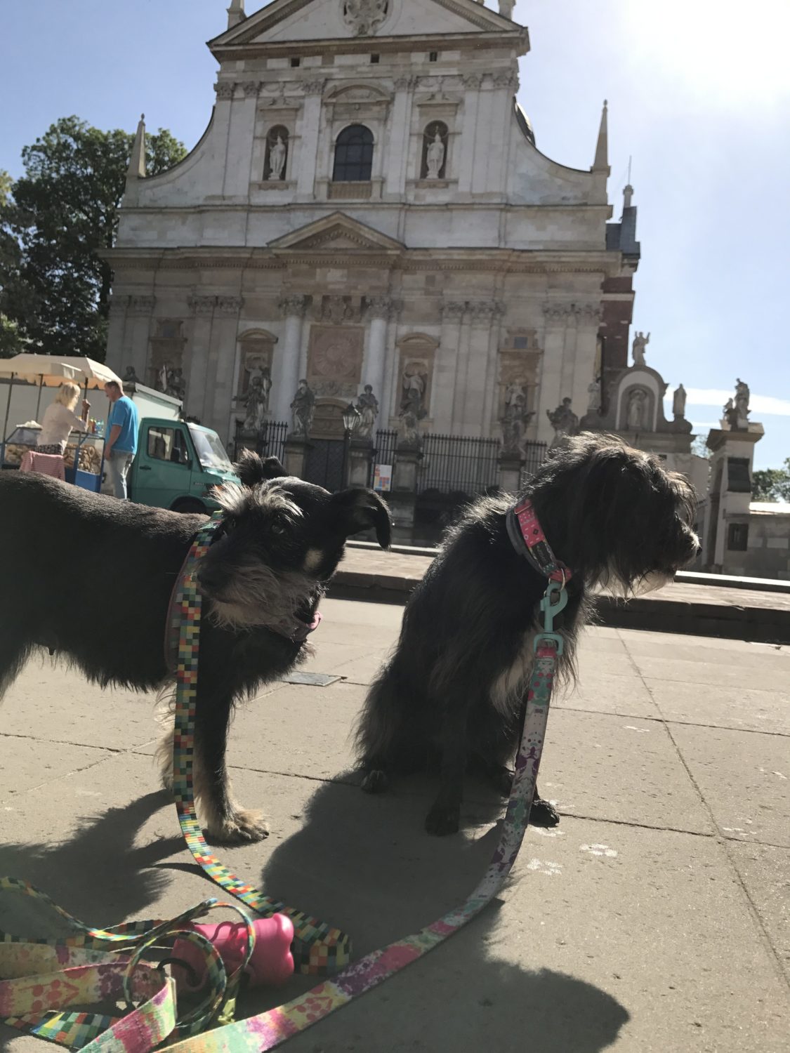 Każdy wyjazd, który jest choćby pokręceniem się po mieście dla suk jest wydarzeniem, absorbującym wszystkie ich zmysły. Nowe miejsca, zapachy, ludzie znienacka głaszczący i cmokający. W takich chwilach cenię sobie częste z nimi wyjazdy. Futra są przyzwyczajone do takich tripów i wygląda na to że to lubią. Nie codziennie, ale jest to dla nich miłe urozmaicenie codzienności. Obie lubią ludzi, nawet obcych, byleby głaskali. Jestem więc W MIARĘ spokojna kiedy zatrzymując się na chwilę, by spojrzeć na mapkę, co by sprawdzić gdzie się to właśnie znalazłam i jak z tego miejsca wrócić tam gdzie być powinnam, spoglądając w dół widzę suki miziane przez jakieś osoby na dodatek mówiące do mnie po hiszpańsku – pozdrawiam przemiłą parę, która w domu zostawiła psa sznaucerropodobnego, prawie takiego jak Pufa 🙂