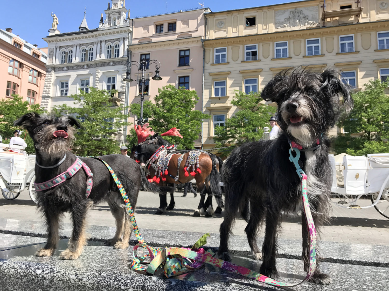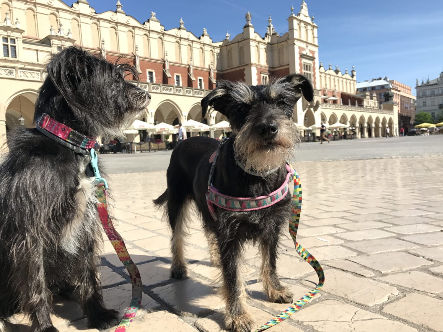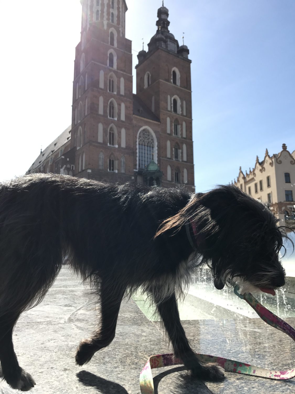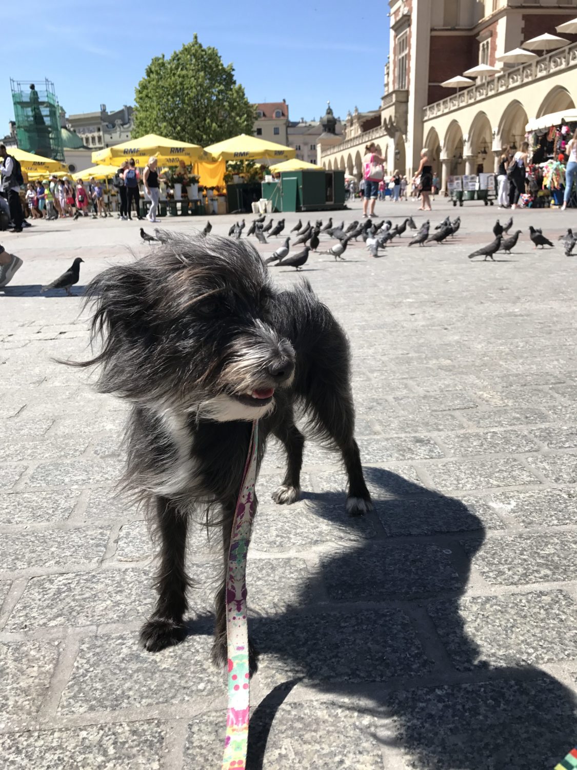 Z Bu historia wygląda zupełnie inaczej. Ona robi wszytko na 120%. Dotyczy to też zwiedzania, musi wszytko powąchać, podejść. Jadąc do Krakowa wiedziałam, że wizyta na Rynku będzie dla nas niemałym wyzwaniem. Konie i gołębie. Jeden z naszych pierwszych dłuższych tripów to Toruń i Ciechocinek i obszczekiwanie i koni przy dorożkach i.. posągu osła. Uroczo. A gołębie? Według Bu te ptaszyska istnieją po to, żeby je pogonić na spacerze po wałach. Czasem wydaje mi się, że traktuje je jak żywe dyski frisbee 😉 A natomiast niespodzianka! Żadnych szczeków, żadnych prób unicestwienia pierzastej atrakcji krakowskiego Rynku! Matron TAKA dumna!