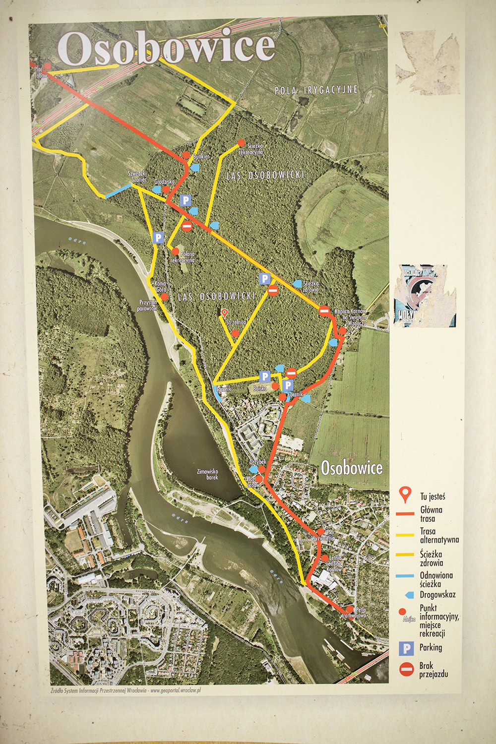 Zaraz obok niego jest wyznaczone miejsce na ognisko. Podobnie jak po drugiej stronie szosy, tu nawet z wiatami. I dokładnie od tej drugiej strony drogi polecam rozpocząć spacer, w ramach rozgrzewki. Bo ponieważ Las Osobowicki oferuje znacznie więcej niż samą zieleninę!