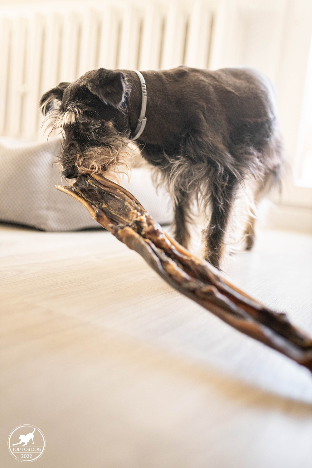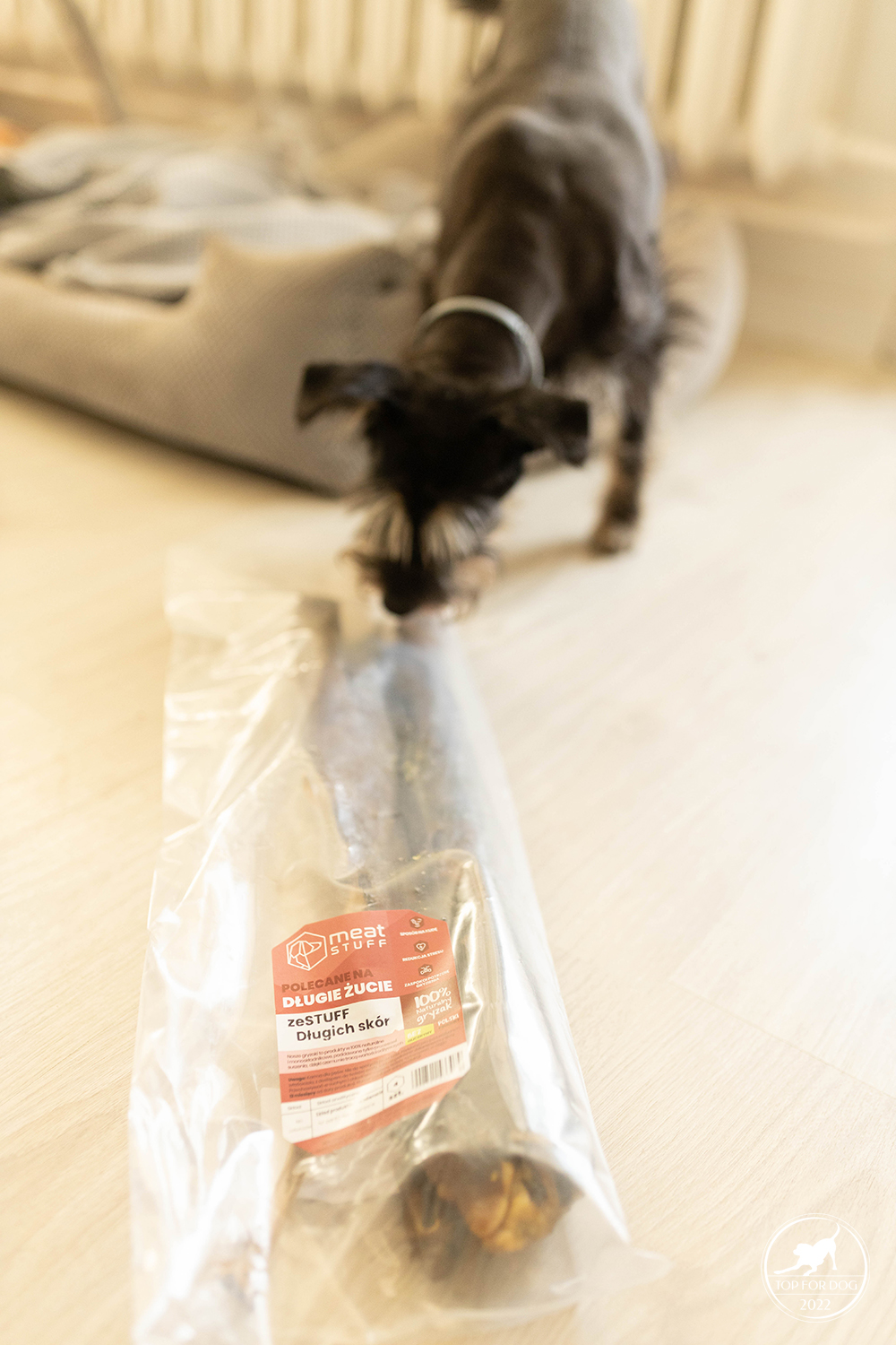 Jest tak taki jeden, bardzo charakterystyczny, bo wielki. A już na pewno długaśny. zeStuff długich skór. Jest serio dłuuugi. Kiedy otworzyłam paczkę, przeglądając jej zawartość po pierwsze zwątpiłam czy niektóre z tych zestawów są aby na pewno dla nas. Moje małe , 9 kilogramowe suczki i takie wielkie mięsiwa? A jednocześnie uznałam, że skoro Pufka dzisiaj ma dzień regeneracji pomiędzy dniami spacerowymi, nich ma jakiś zajęcie. I niech sama wybierze sobie co chce memlać. Pufiaczka do grzebania w kartonach z żarciem zachęcać długo nie trzeba. Zanurkowała i wyciągnęła. Własnie ten pokaźnych rozmiarów zestawik. Nie na jej wielkość,przecież to małopyskowy piesek kanapowy. Ale co mi tam- będą fajne fotki chociaż z tego. Tak tak, to była moja motywacja, żeby zezwolić na zmierzenie się mojej prawie 11 letniej geriatrii z wyższym poziomem gryzaków. Co tu dużo mówić- matron roku. Nie wiem jak to rokuje na Miśki przyszłość, ale może być ciekawie 😛
