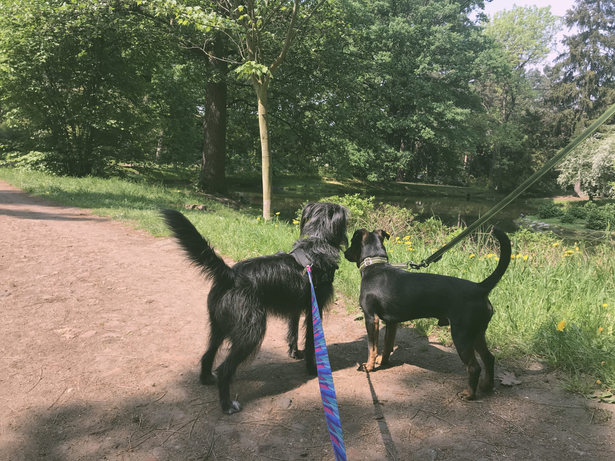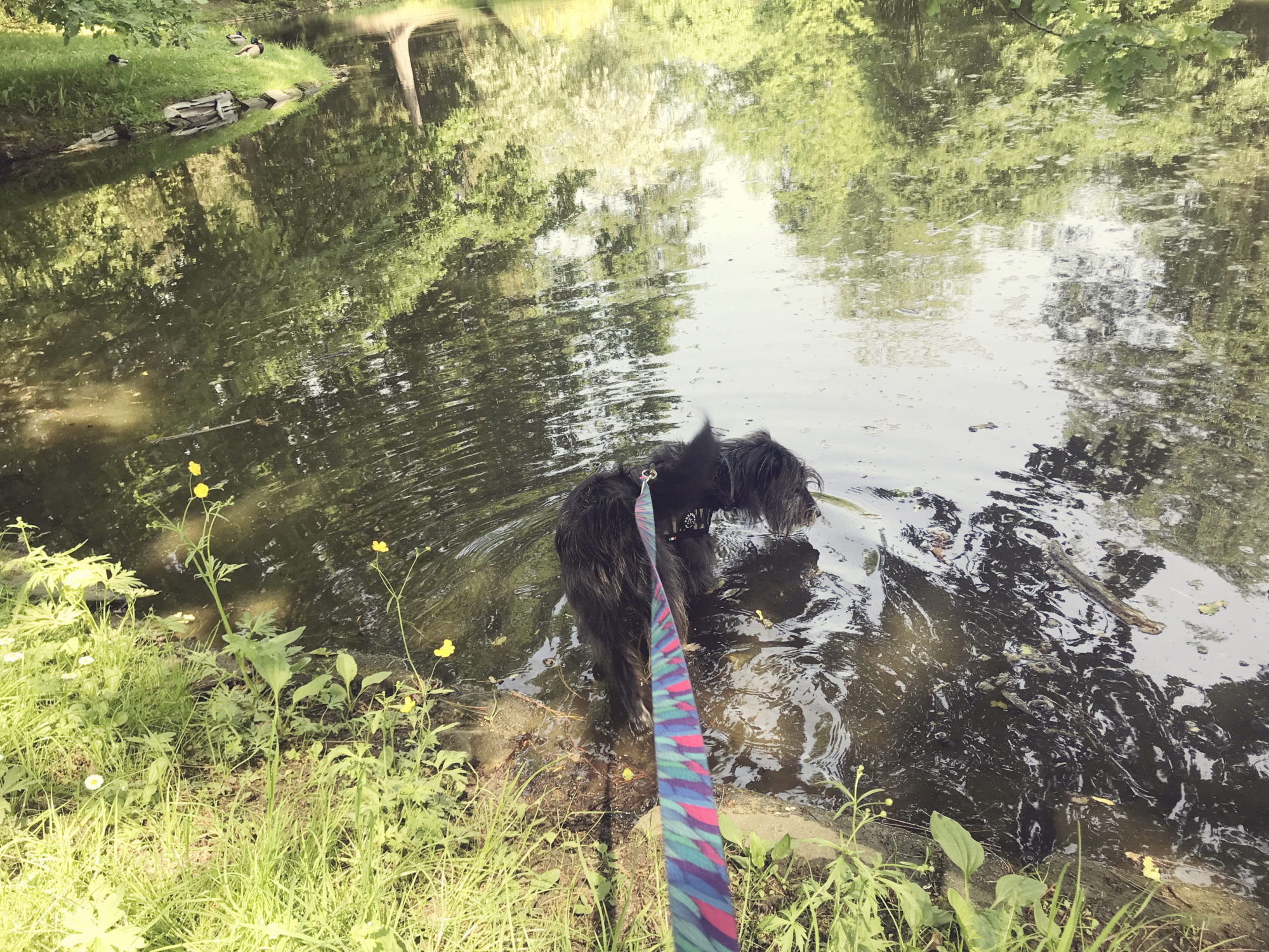 A teraz spacer! My wystartowałyśmy z Mostów Warszawskich i podreptałyśmy wałami w kierunku Parku Szczytnickiego. To moja dość często odwiedzana trasa – lubię ją bo Bu ma sporo miejsc do pomoczenia dupala, za to my z Pufą mamy okazję nie smażyć się na słońcu, a iść cieniem drzew. Niestety, zaczął się sezon grillowy, więc ja mam zez rozbieżny przez pilnowanie suczydeł, które chętnie zmieniłyby się w ekoodkurzacz samobieżny, czyszczący wały z resztek kiełbach i karkówek. P.S: Wasze futra też gustują w grilowanych przekąskach? Dodatkowo jak już grillowanie się rozhula (chwała chłodniejszym dniom!) będziemy musiały ograniczać wolny wybieg spacerowy przez szkło, puszki i insza zagrożenia fizyczne. Czasem mam ochotę olać sprzątanie qpali na wałach letnią porą, nachodzą mnie myśli, że jak komuś pośmierdzi qpal odechce się mu grilować. Niemniej mam nadzieję, że skoro ja potrafię się schylić i posprzątać po swoim psie coś, co najwyżej ubybra komuś buta, inni będą potrafili zabrać śmieciuchy 🙂