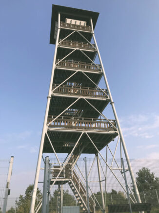 Wieżę widać bardzo dobrze po dojściu do brzegu zalewu, są jednak też tabliczki kierujące do niej. I teraz ciekawostka- według tabliczki na płocie okalającym wieżę zakaz wejścia z psem na górę, ale okoliczni napotkani mieszkańcy jako żywo zachęcali do wejścia i skorzystania z widoków. Mało tego zarzekali się, że oni ze swoimi psami przy okazji spaceru wieżę zdobywają. Nieażurowe schody bardzo zachęcały do wejścia z futrami, ale zakaz to zakaz , a my się nie pchamy gdzie nas nie chcą.