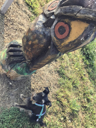 A skoro „wokoło” tematów jesteśmy to ten punkt to nie tylko pozostałości Pawilonu. Zadbany teren wokoło to tez prze-u-ro-cza ścieżka edukacyjna o zwierzątkach. Mam pewne podejrzenia, że grupą docelową, która ma być w ten sposób edukowana jest przedział wiekowy mobilność ruchowa/ ostatki zainteresowania tym co rodzice pokazują ale i ja miałam niezłą frajdę czytając podpisu i robiąc sobie selfiaczki z wyrzeźbionymi kumakiem czy salamandrą. I zdecydowanie odpieram zarzut o niedojrzałości równocześnie podkreślając że ja po prostu potrafię doceniać to co się wokół mnie dzieje i czerpać z tego radość. Tacy podobno żyją dłużej 😉