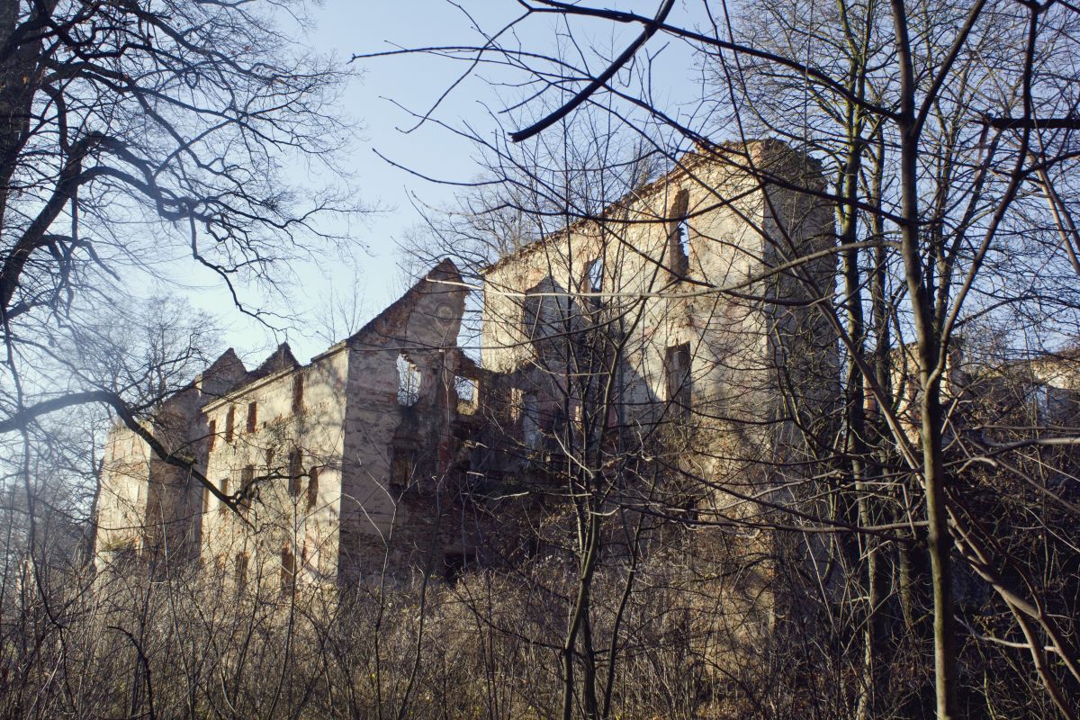 Pielaszkowice (Plaswitz). Około 45 km od Wro. Największy obiekt jaki odwiedziliśmy w weekend. Przy tym pałacu trzeba trochę wysilić wzrok. Bo niby mur jest, kocie łby też, a ruin ni ma. Ano są, tylko ukryte między drzewami. I to kolejny punkt dla początkujących poszukiwaczy – wyruszajcie na wyprawę jesienią czy zimą, wtedy kiedy na drzewach nie ma liści – łatwiej toto znaleźć i nic nie zasłania samej budowli przy okazji zdjęć. W przypadku Pielaszkowic myślę, że wiosną czy latem niewiele będzie widać 🙂