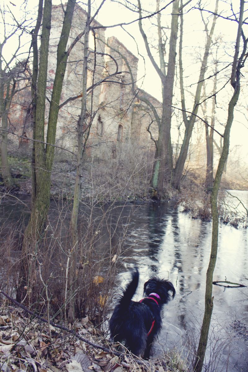 Dodatkowa atrakcja – jeśli chcecie obejść pałac wokół – trzeba dać sus przez rzeczkę zasilającą „fosę” przy budynku. Niestety, pełnej pętelki wokół nie zrobiliśmy – przez płot w oddali i odgłosy szczekania, które po porównaniu do szczeku Bu dały nam obraz minimum 60 kg brytanów, do których lepiej za blisko nie podchodzić 🙂