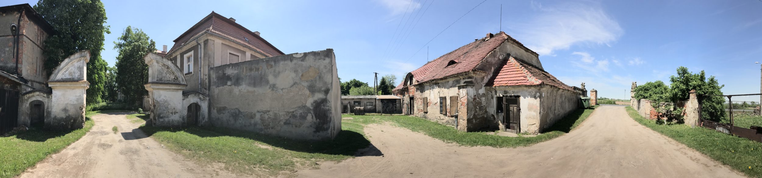 Tradycyjnie niewielka miejscowość, wyjątkowo zadbana. Pozwalam sobie powiedzieć wyjątkowa, zbyt często ruiny przepięknych klasycystycznych budynków stoją pośrodku zaniedbanej miejscowości z rozpadającymi się wokół barakami, delikatnie mówiąc burdelem w obejściach, składem złomu itd., boleśnie kontrastującymi z minionym pięknem pałacu. I gdzieś na jej końcu mignął mi mur. Tak,