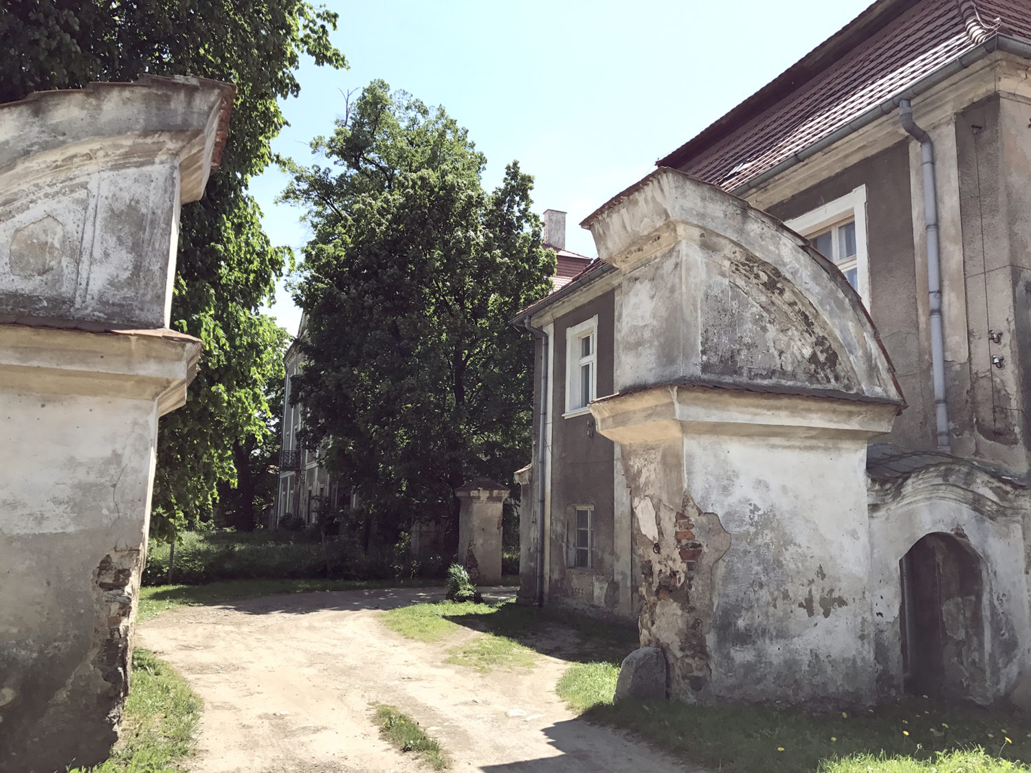 Za każdym razem wchodzenie na taki teren jest dziebko ryzykowne – w niektórych budynkach przypałacowych czasem ktoś mieszka – luźno biegające psy, a raz i gęsi. Nie zawsze pozytywnie nastawieni ludzie itd. Tym razem wokół nikogo, a napotkana nieopodal para spacerująca z dziećmi utwierdziła nas, że wejść można, bez obaw, dodatkowo polecając jeszcze inne miejsca w okolicy i.. dziwiąc się samym sobie, że nie potrafią nic powiedzieć o pałacu, mieszkając obok niego całe życie. Jak to się mówi „cudze chwalicie, swego nie znacie” 🙂