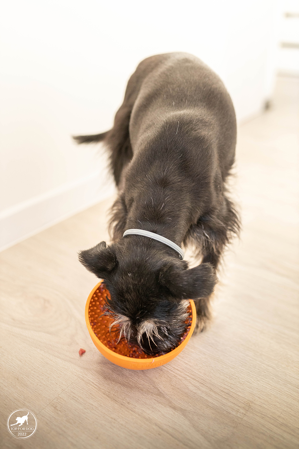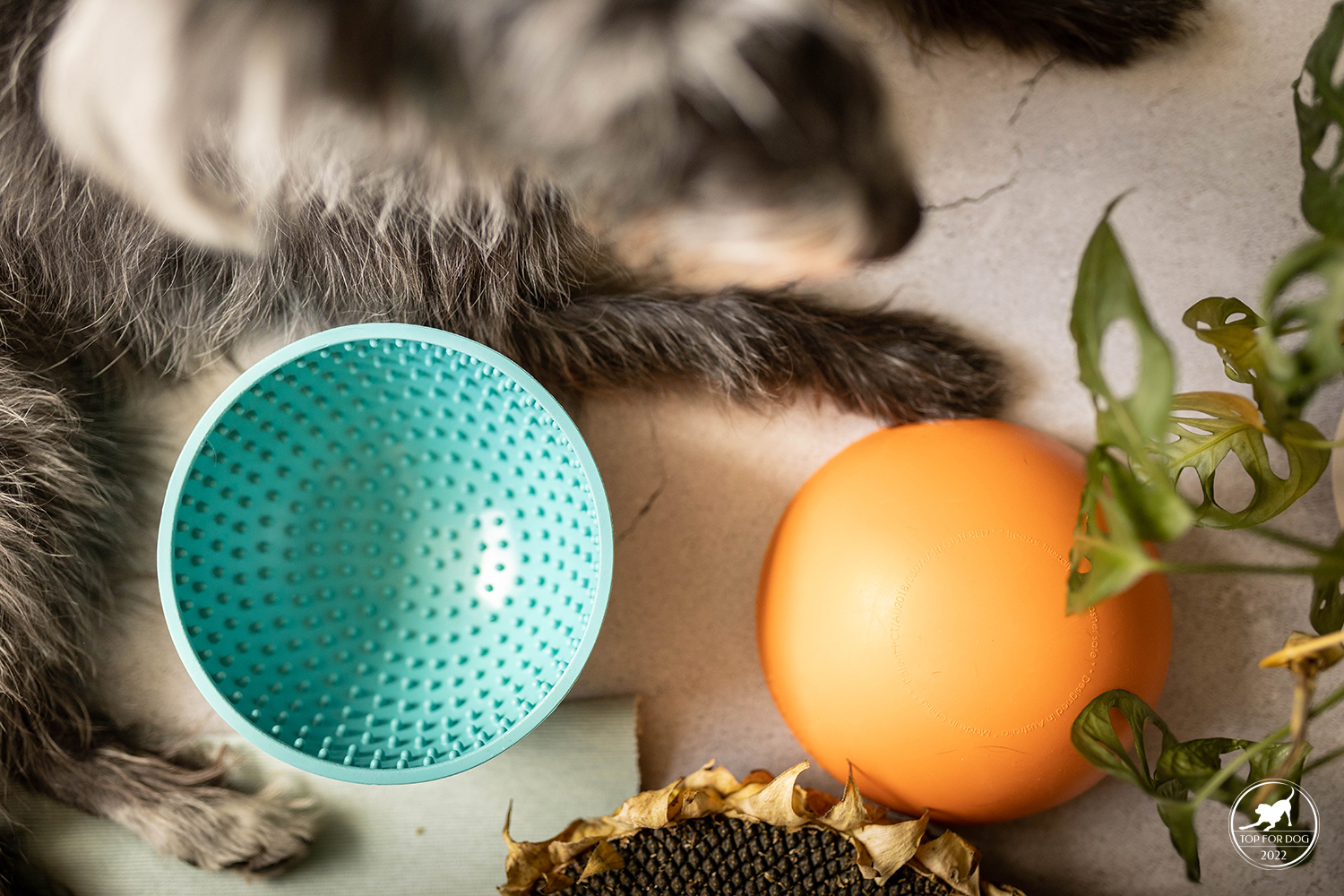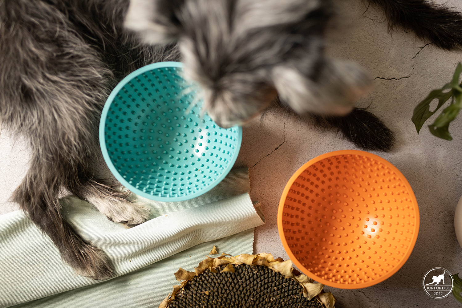 Ja korzystam z tych misek do każdego rodzaju mokrego jedzenia. Na co dzień – kiedy podaję Sukom na śniadanie mielone mięso. Dodatkowo kiedy pcham w michy jakieś puszki, tacki czy inne pasty. Wszystko łatwo się rozprowadza, a jedzenie pięknie „utyka” pomiędzy wypustkami, nie tylko utrudniając wydobycie pyszności, ale i stymulując psa. Czucie na języku ma każdy. Myślę, że takie wypusteczki mogą być wręcz przyjemnym masażem dla paszczy 😀