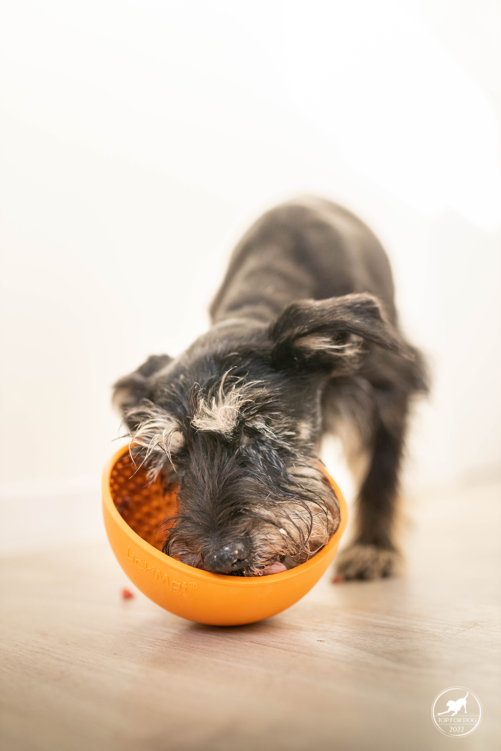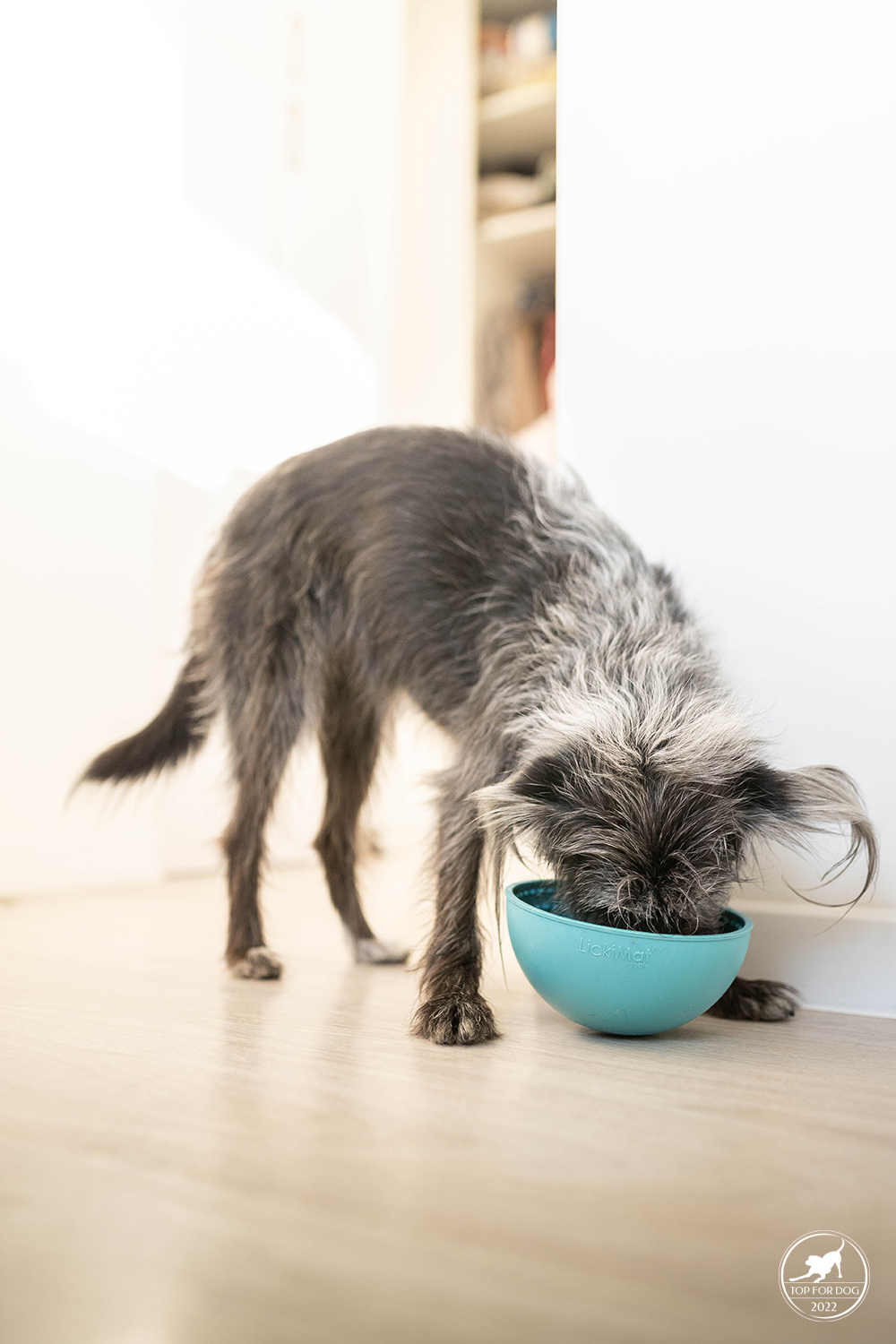 Większość zapewne pokłada w lick matach nadzieje na uspokojenie psa, wyciszenie, spowolnienie pochłaniania jedzenia. I ja też tak mam! Jeśli chodzi o Bu. W przypadku Pufinki małe frustracje, pobudzenie do działania, a nawet wkurzenie jej, jest jak najbarwniej na propsie. To taki odwrotny piesek. Cieszę się więc ogromnie, że stara się bardzo wyjąć jedzenie z Wobblera z całych swoich pufiaczkowych sił